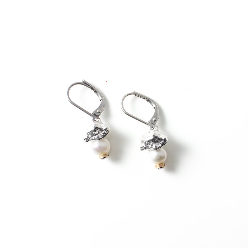 Dénia: semi-long earrings, easy to match. They will add a touch of sparkle to your ensemble. Fall for this pearl and pewter combo. Discover threading duos where material meets color and metal. The games are endless with our latest creations of pearls, gold, pewter and glass.