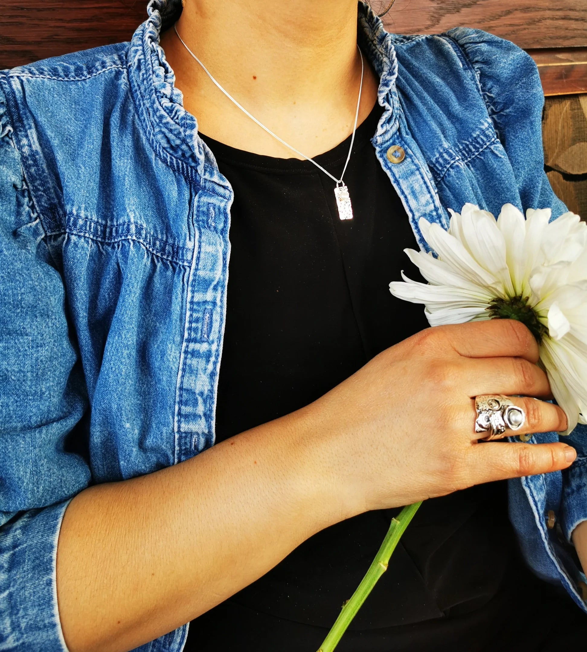 This ring is a testament to a quest for meaning for sweetness. This sterling silver creation is made like a ribbon that is layered on top. On top of the ring is a flower.