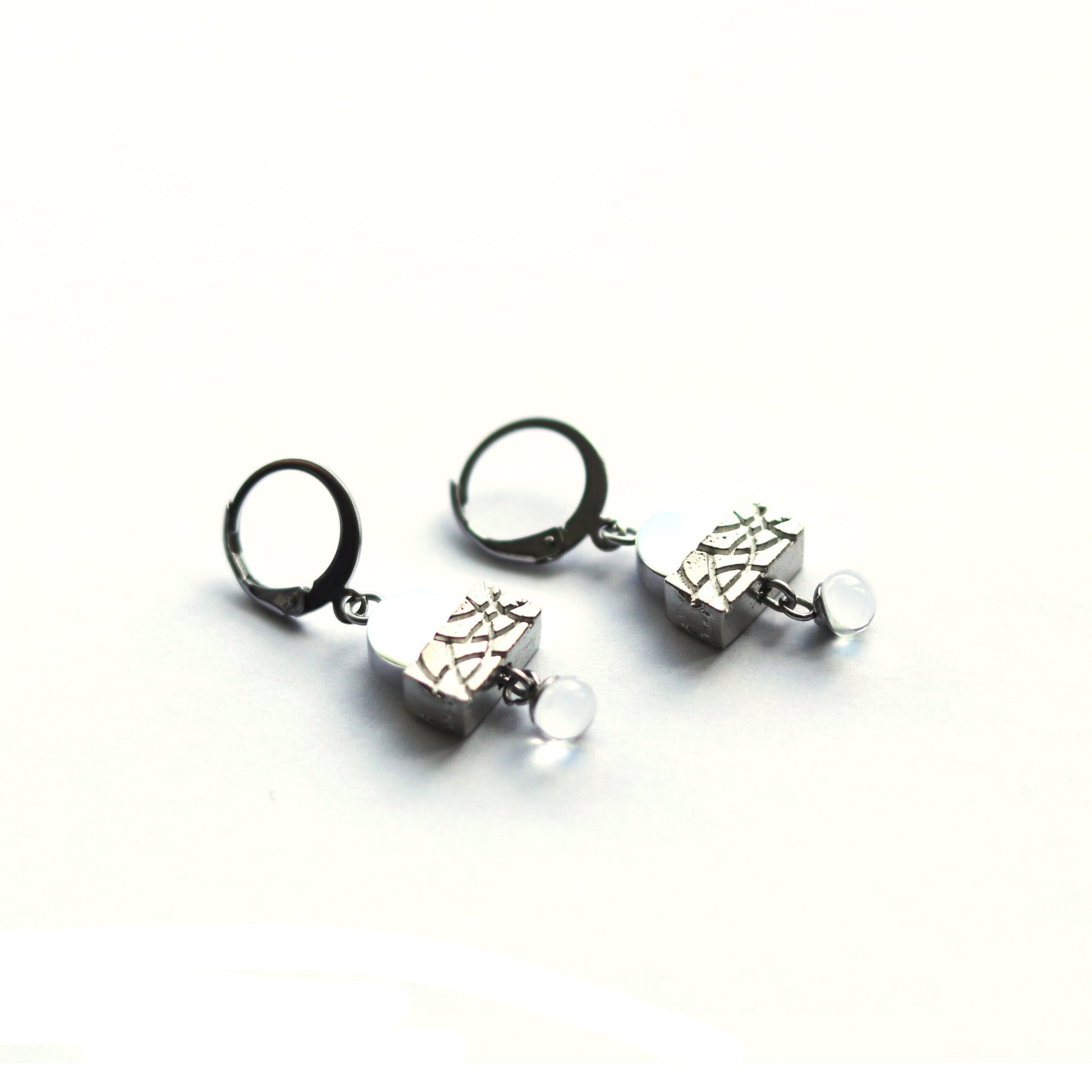 The new "Sunset" earrings are creations made from steel French hooks (hypoallergenic). In addition, the earrings are equipped with a round and shiny piece of steel, a pewter piece as well as a glass pearl meticulously made in our workshop.