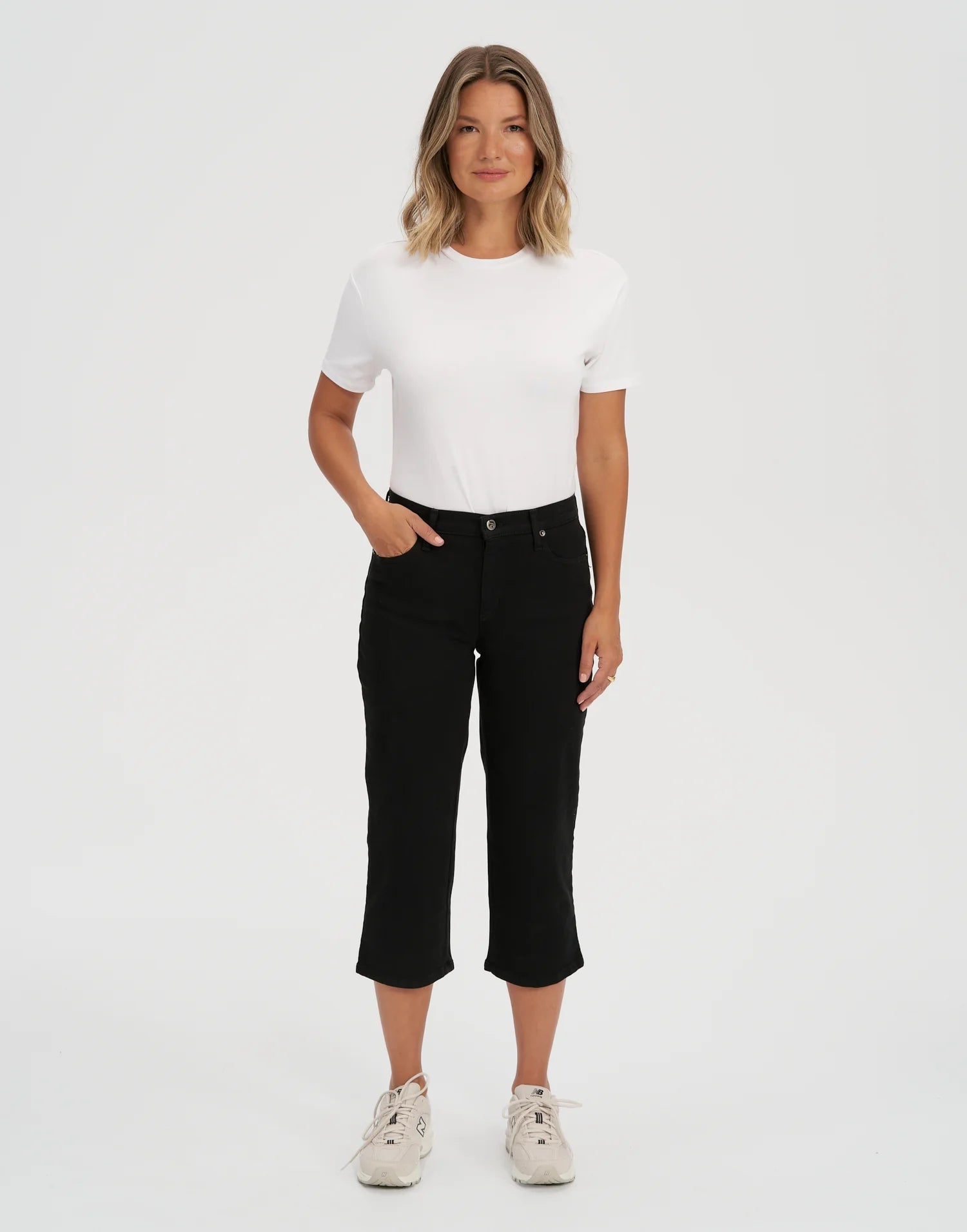 Our Chloé straight-leg jeans are fitted from the waist to the hips, tapering from the knee down. The inseam is 21" with a regular rise. Their capri length and black hue make them a must-have for the summer season.