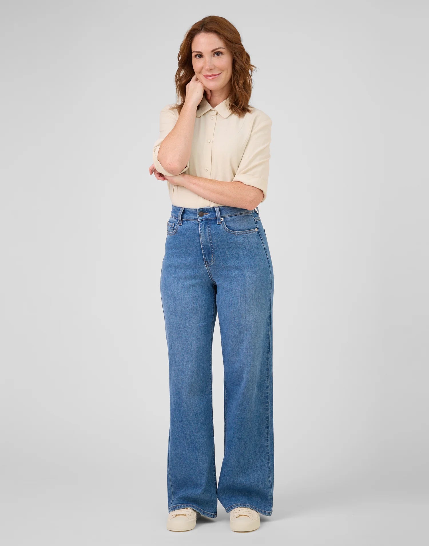 Check out our Rio high-waisted, super-flare jeans in a medium blue wash! With a 32-inch inseam, they embody modern classic style.