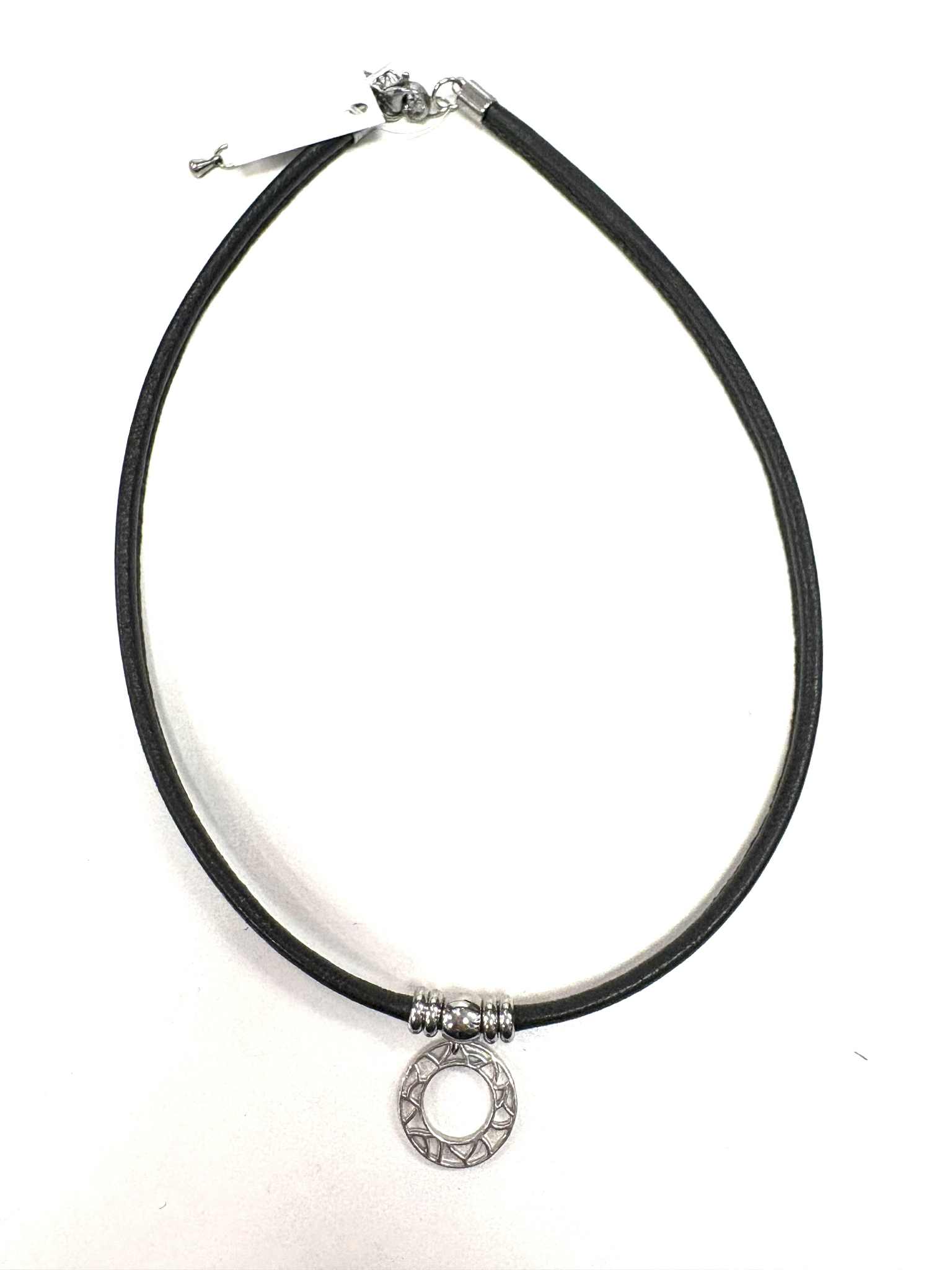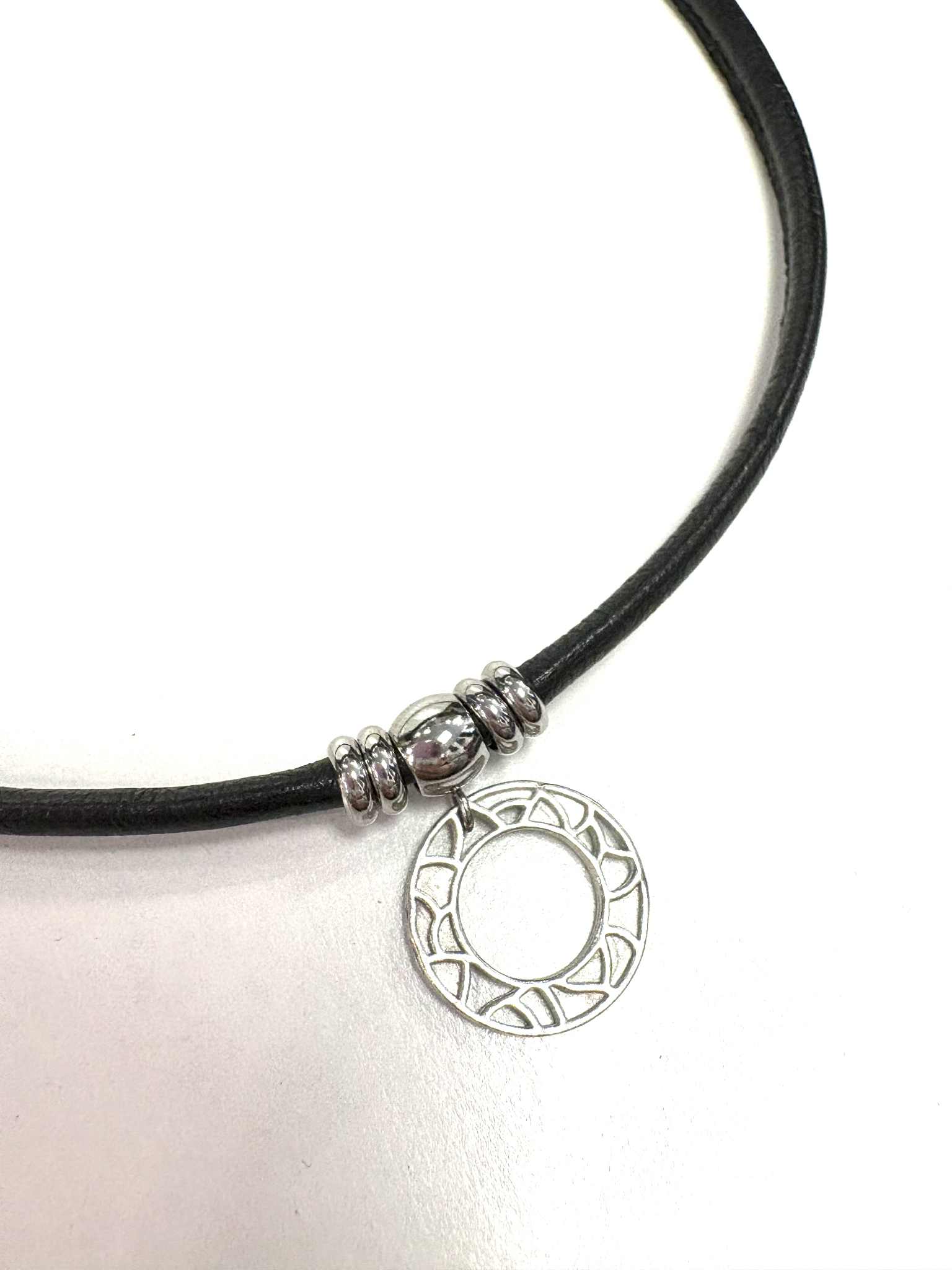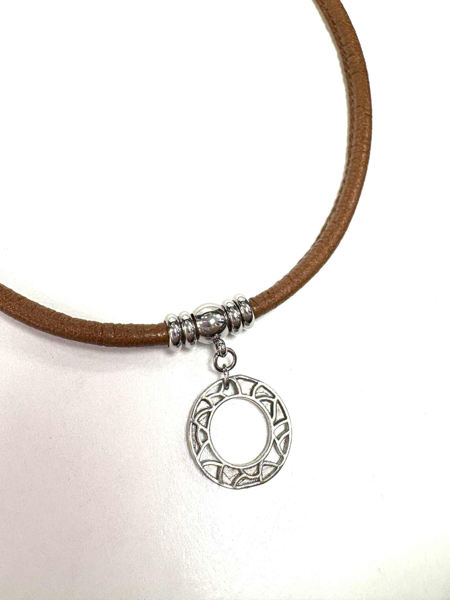 Joli collier avec cercle motifs en étain. Chaque pièce d’étain est méticuleusement dessiné dans notre atelier et fabriqué ici. Le collier est muni d’un fermoir de type crabe en acier inoxydable et de cuir véritable. Il est offert en différentes couleurs.