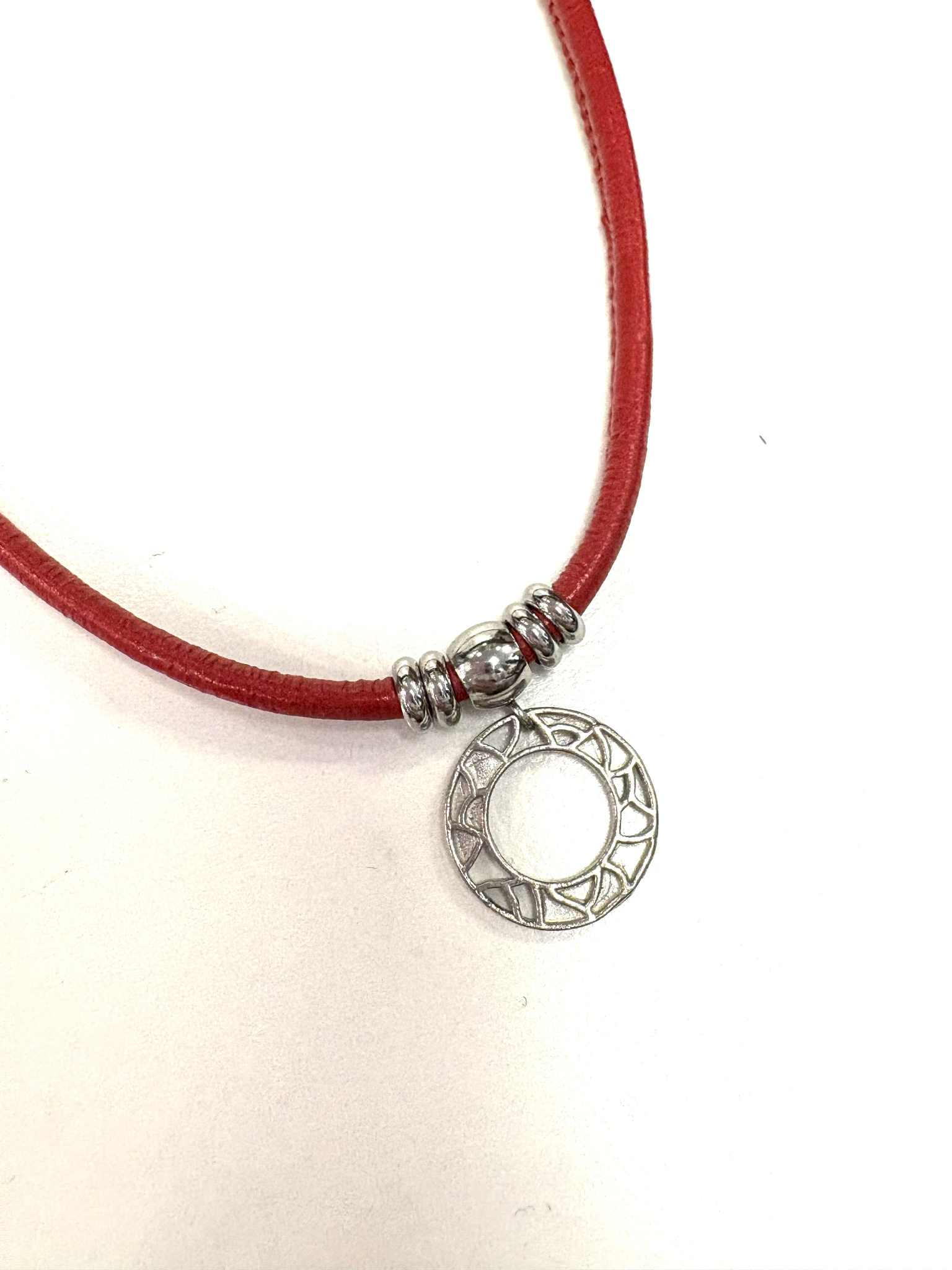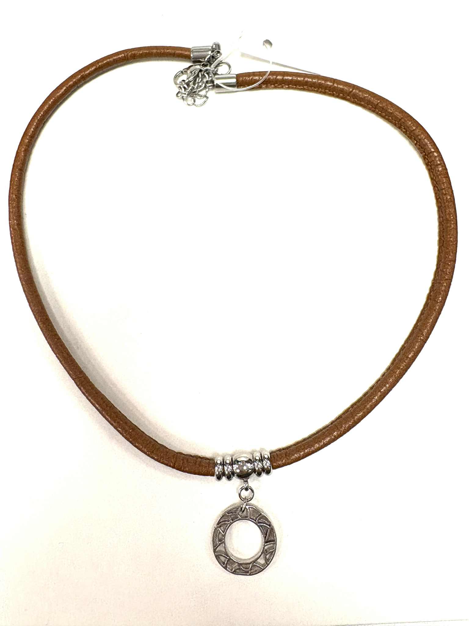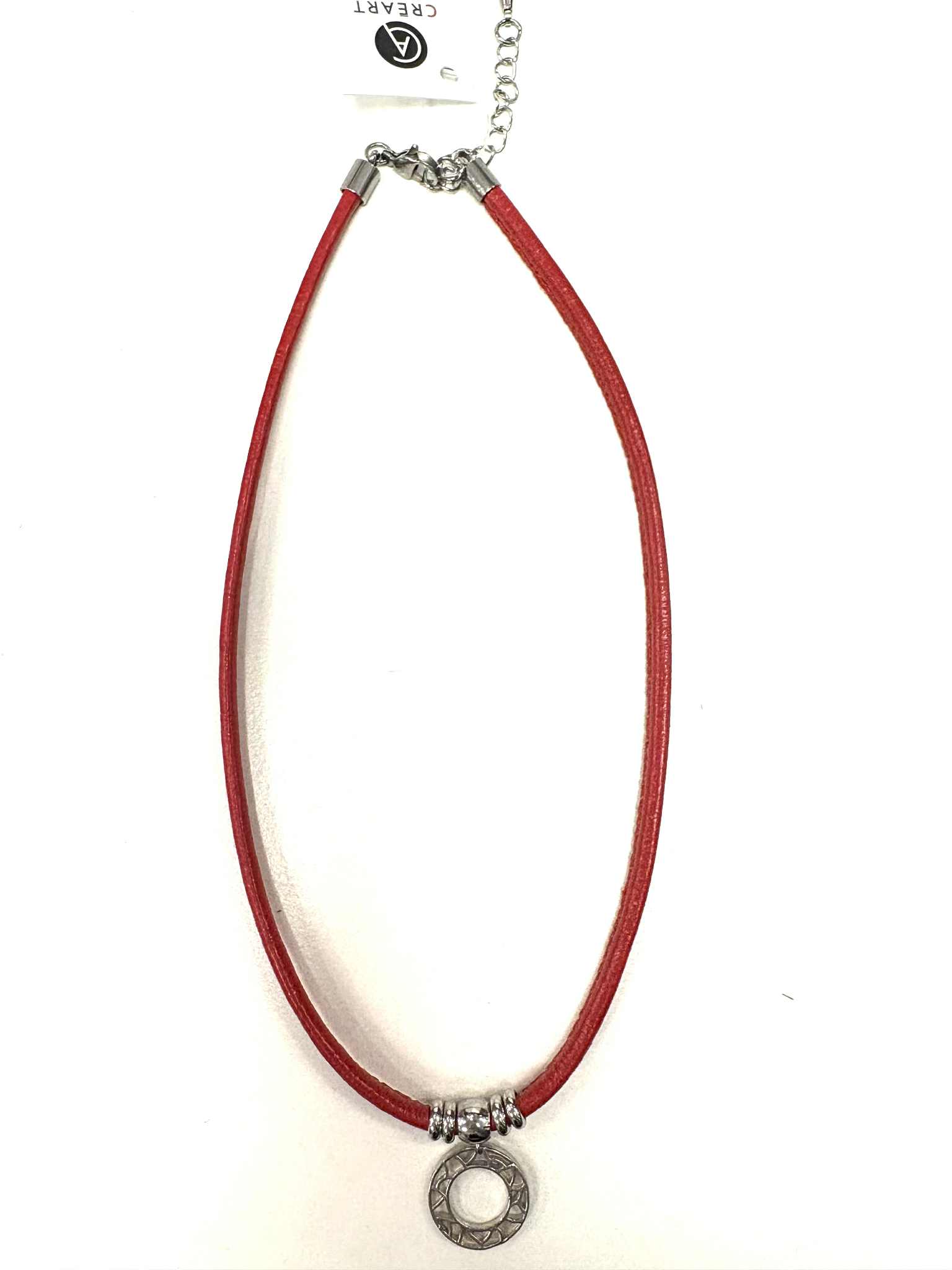 Joli collier avec cercle motifs en étain. Chaque pièce d’étain est méticuleusement dessiné dans notre atelier et fabriqué ici. Le collier est muni d’un fermoir de type crabe en acier inoxydable et de cuir véritable. Il est offert en différentes couleurs.