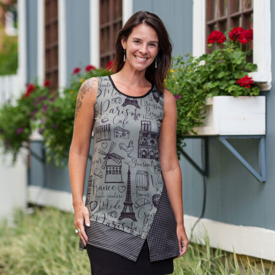 Here is the tunic that rekindles Parisian passions. The Françoise tunic will take you on a journey with its original patterns, all inspired by the great classics of the City of Lights. Its magnificent patchwork style combines gingham patterns and fine stripes with this unique print. To round off this European journey, a pretty button is sewn at the tip of the opening at the bottom of the tunic, like the lighthouse crowning the Eiffel Tower. For those who have a weakness for original details, in the back, note the opening decorated with a black bias at the top of the tunic.
