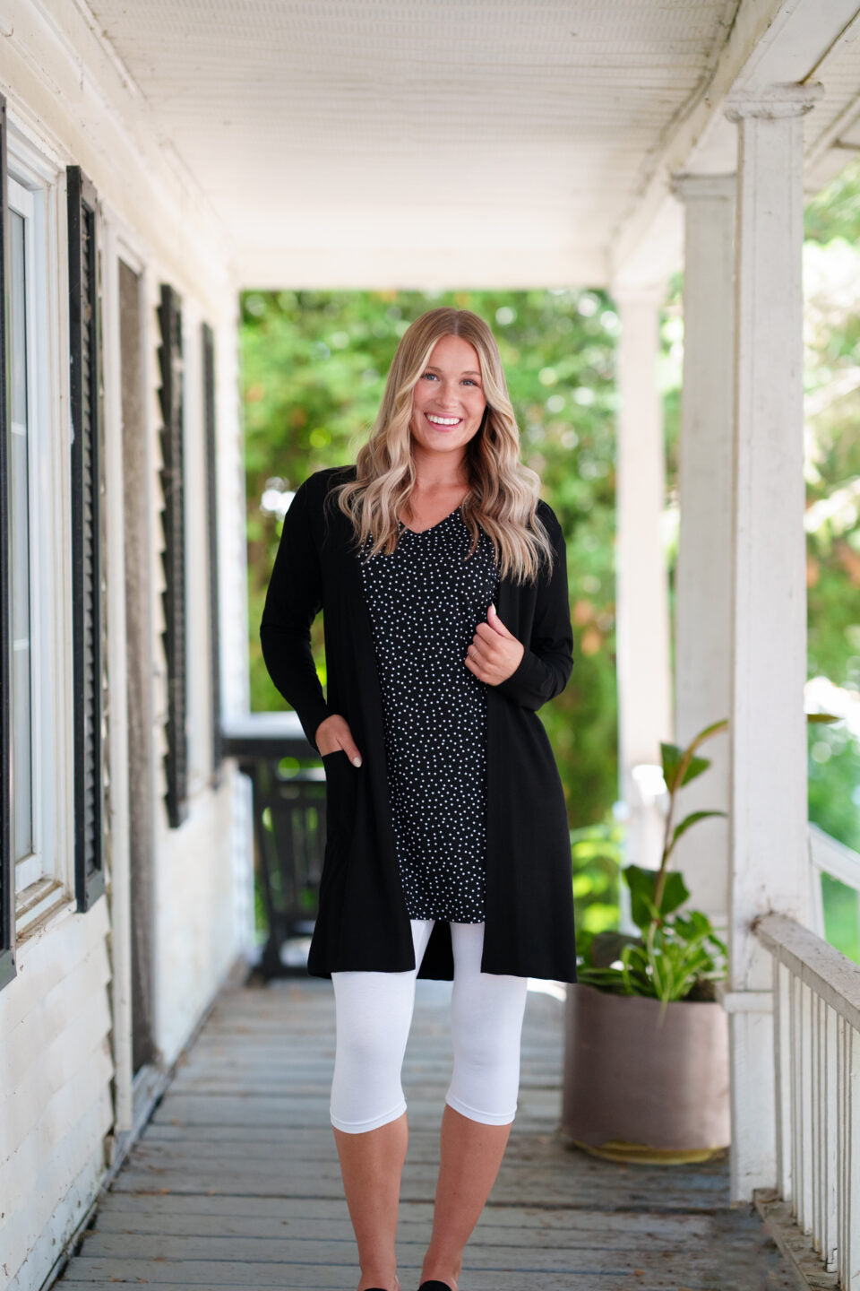 So many combinations are possible with the Martini tunic! The black & white polka dot pattern goes perfectly with our white or black and black punch 3/4 leggings, our black Piña 7/8 pants and our black Petunia jacket.
