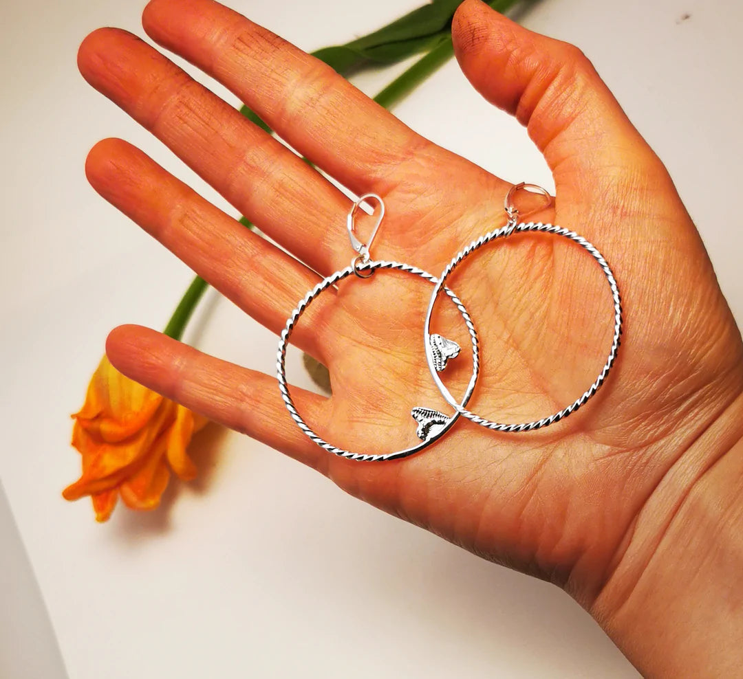 Voici les moyennes boucles d'oreilles ANNEAUX PENDANTS en argent sterling .925 conçues avec un fil lisse et torsadé. Le tout agencé à un petit coeur empreint d'une texture d'un coquillage d'oursin de mer. L'anneau qui accueille le coeur est mobile.