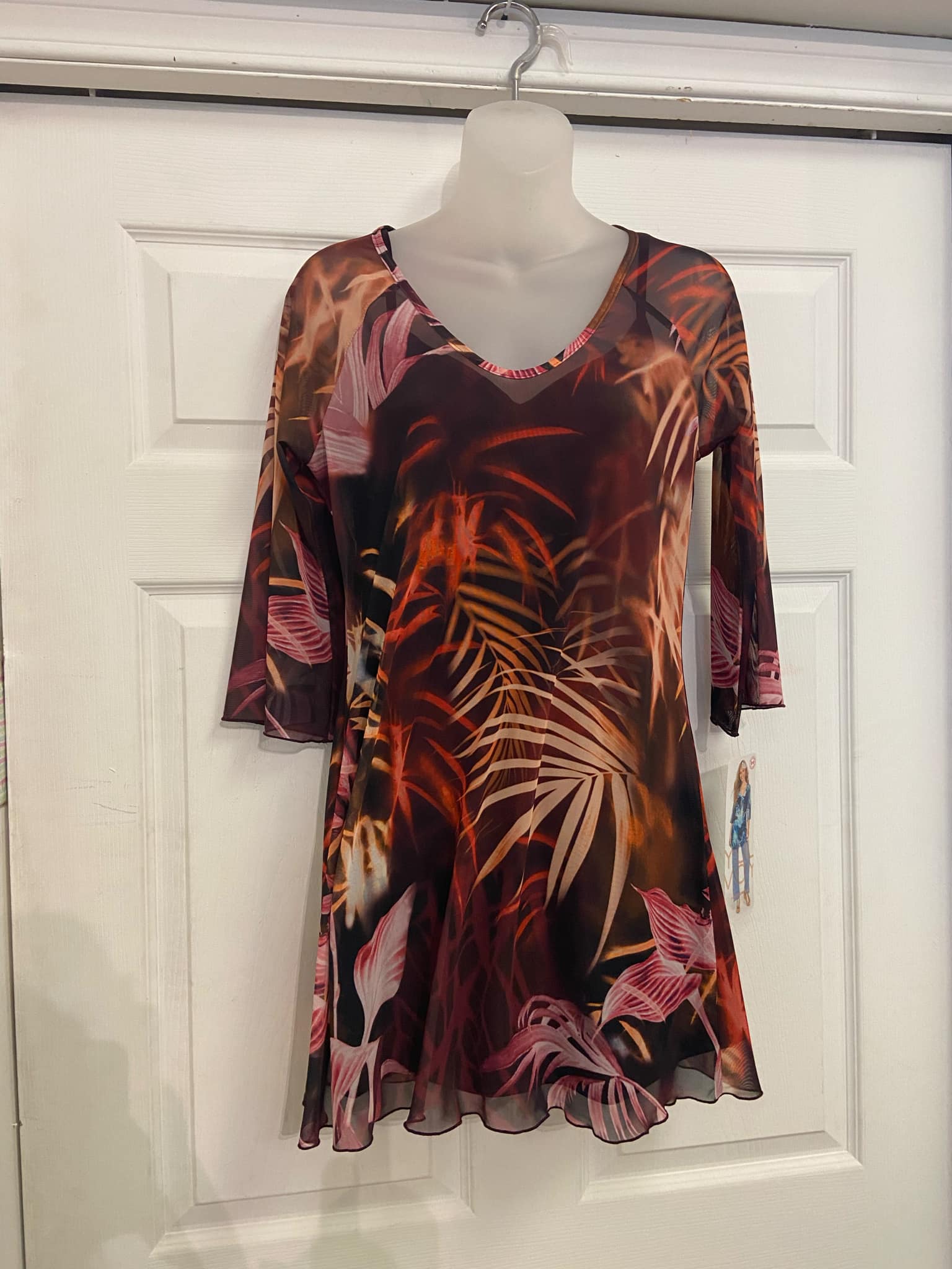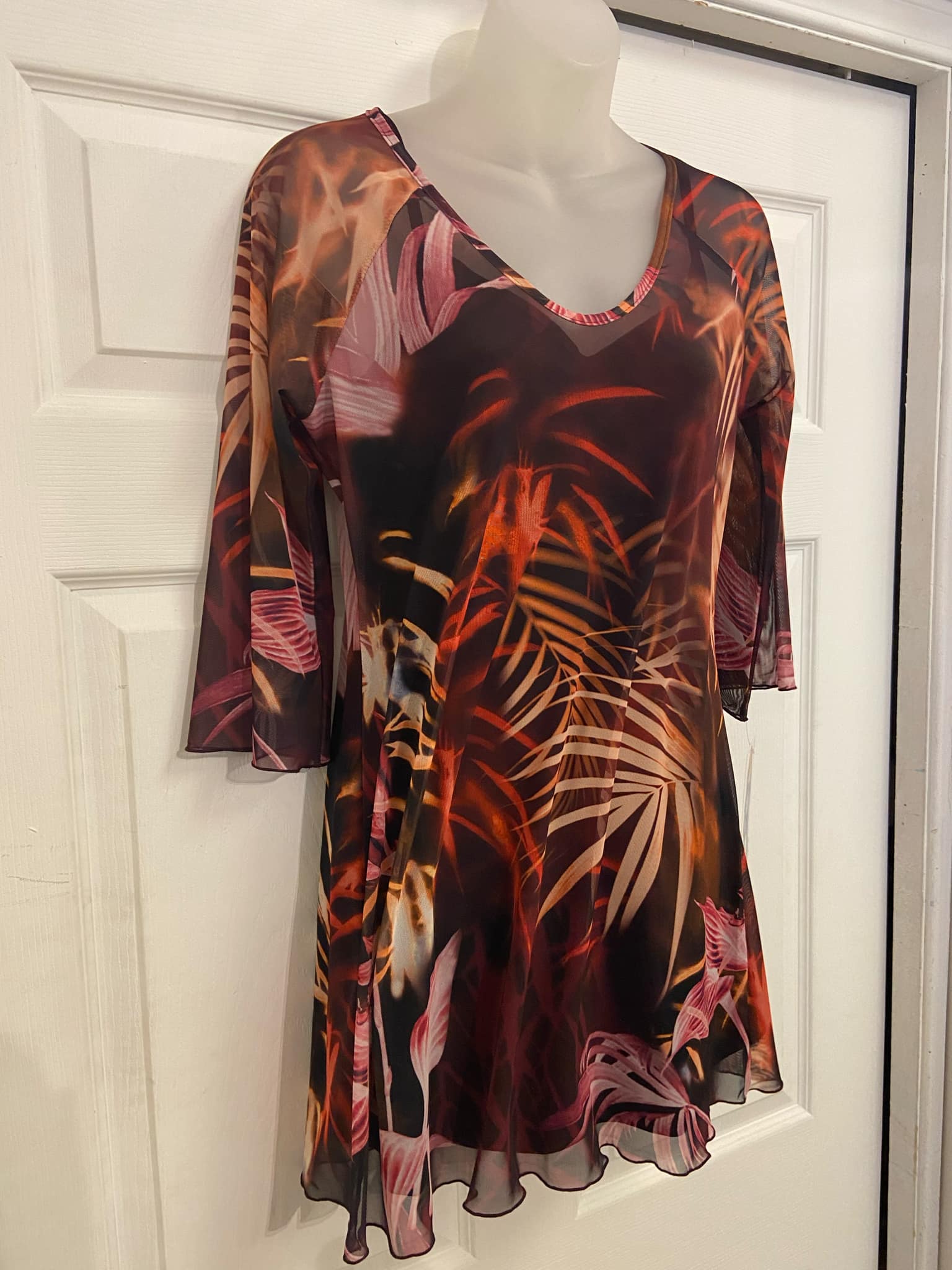 Tunique fluide à imprimé tropical. Manches trois-quarts et encolure en V. Idéale pour un look estival décontracté sur un jean ou comme paréo élégant à la plage.