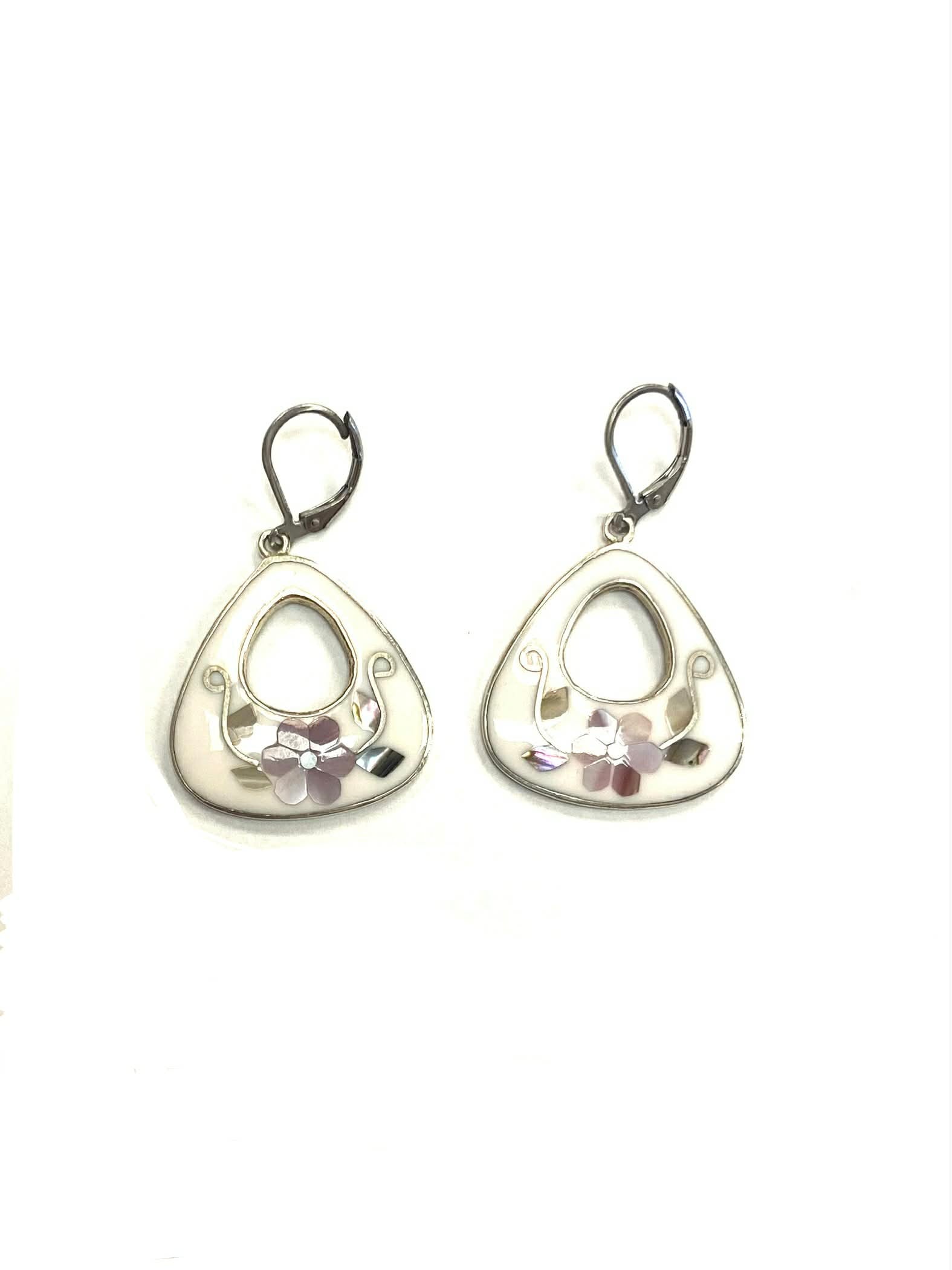 Boucles d'oreilles en forme de triangle arrondi ornées de motifs floraux nacrées avec attache pendante.