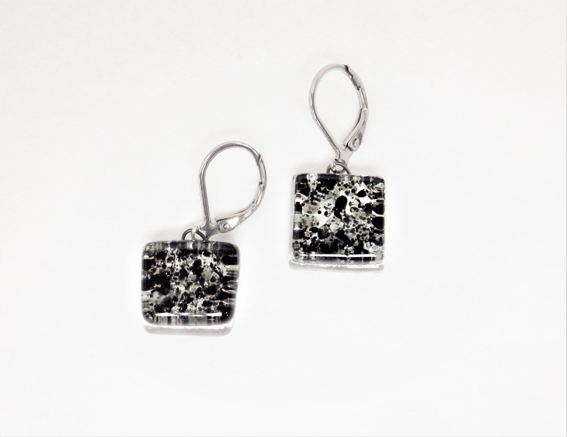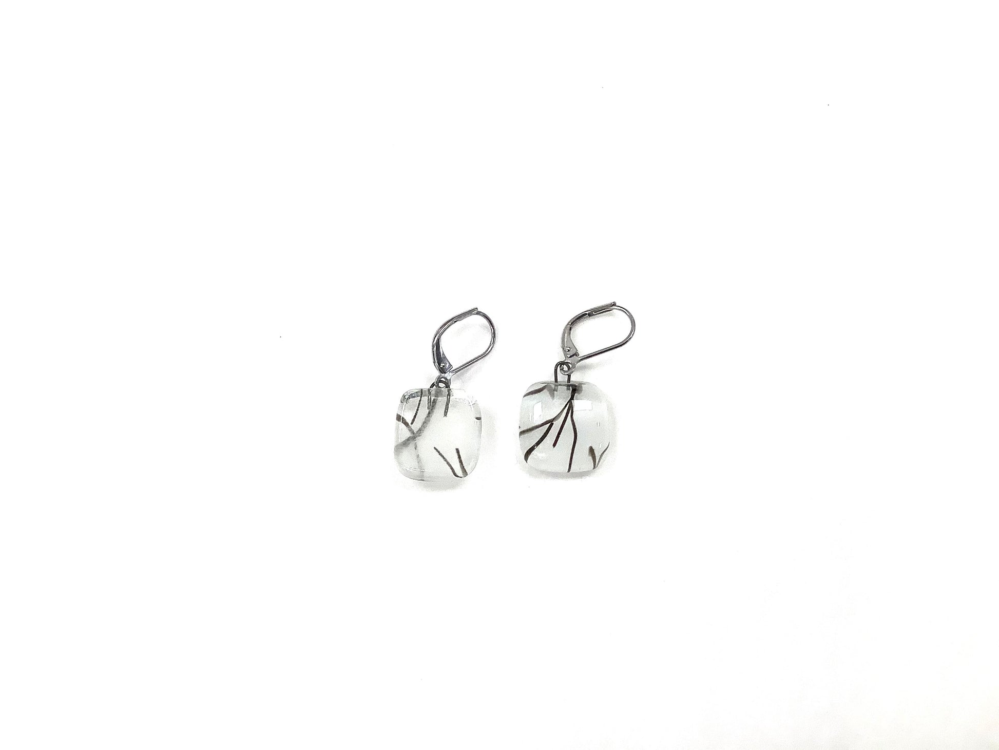 Boucles d’oreilles en verre sur tiges en acier inoxydable (matières hypoallergéniques). Entièrement dessinées, conçues et fabriquées au Québec.