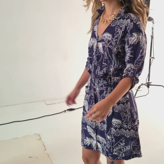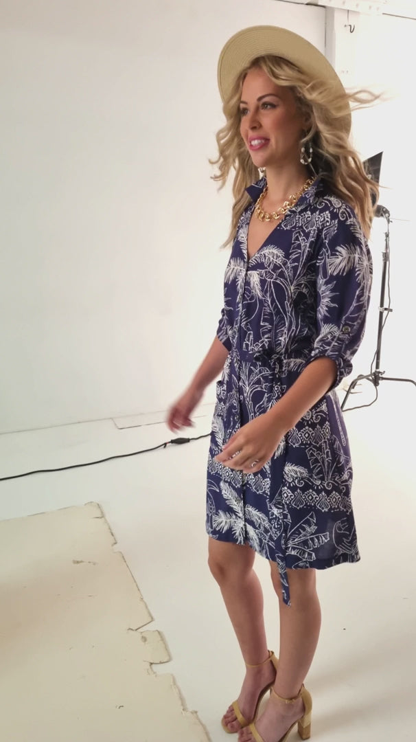 Robe courte bleu marine à imprimé tropical blanc. Manches trois-quarts et col classique. Ceinture à nouer à la taille pour une silhouette définie. Idéale pour un look estival chic et décontracté.