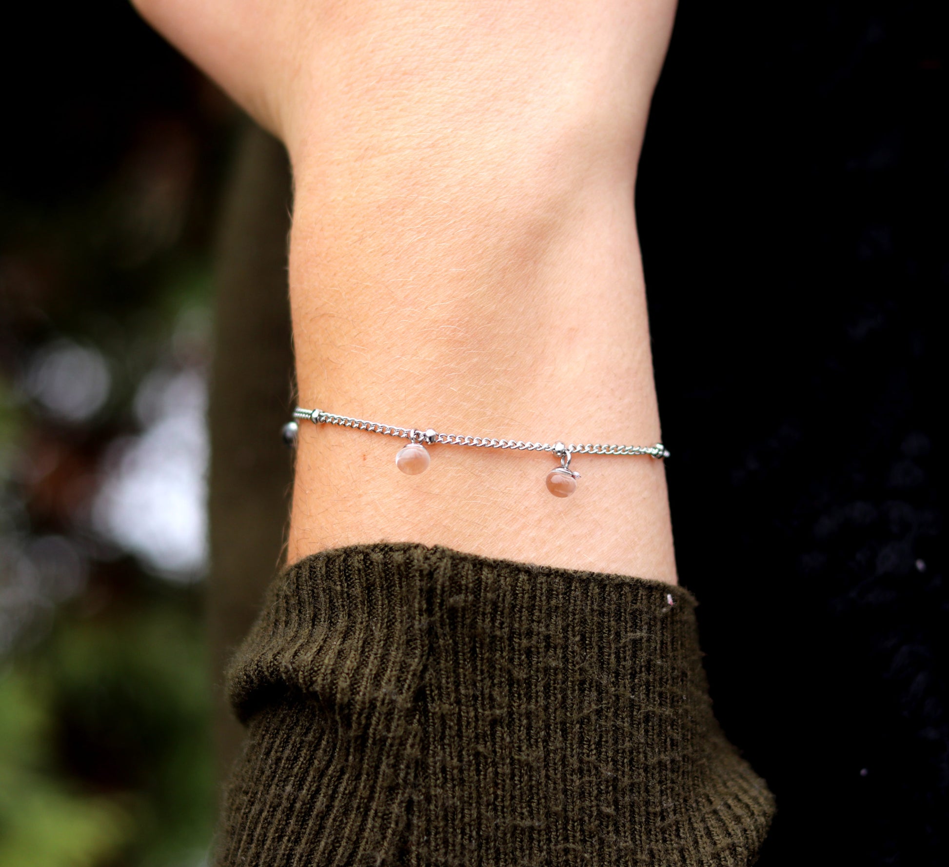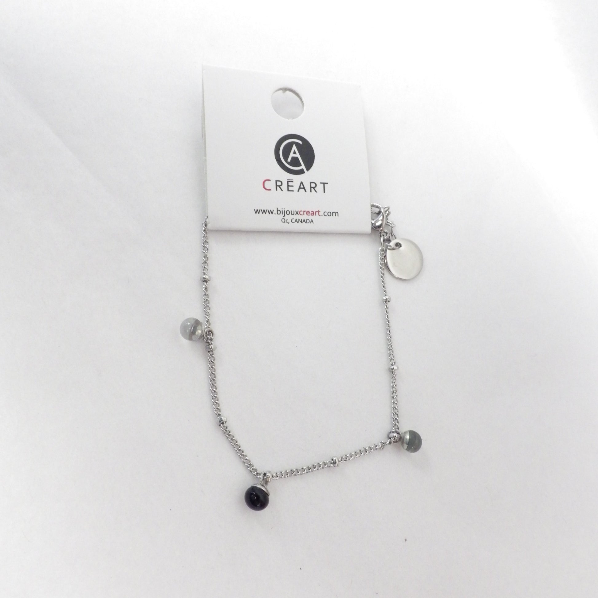 Le bracelet complexe Light est très beau. Il mesure au total 22 cm et il est en acier inoxydable (hypoallergénique et 5 minis petites perles(5mm) de verre sont suspendues. Le bracelet est délicat, léger et facile à attacher là ou vous voulez.