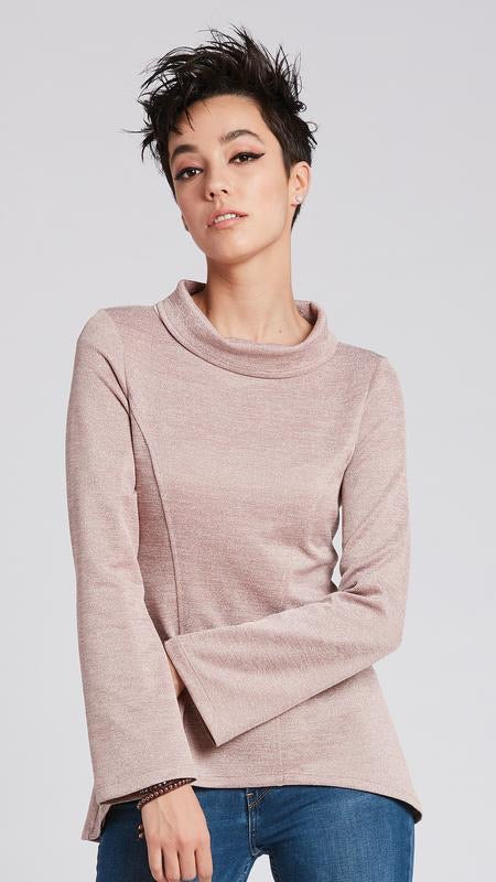 Rose acier avec fils argent légèrement scintillants, Coupe ronde asymétrique plus longue au dos.