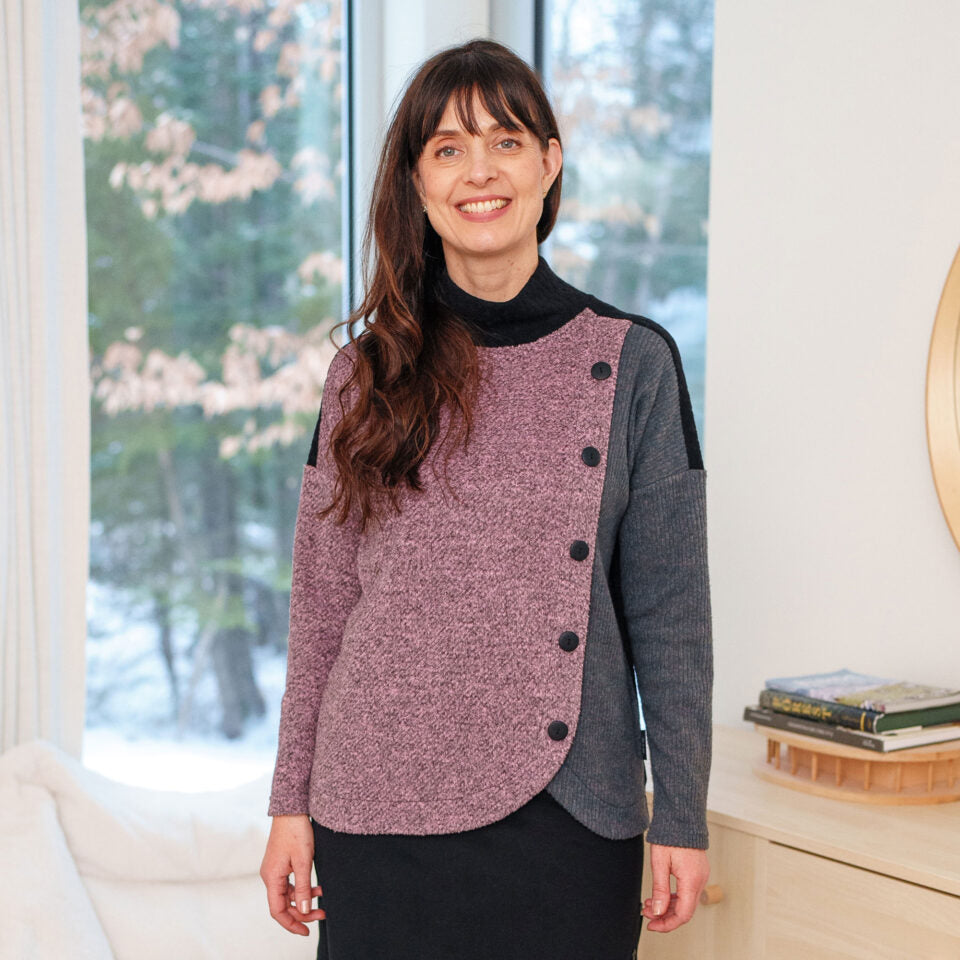 Que vous choisissiez la couleur rose, sauge, ou les deux, il se porte à merveille avec notre jupe-legging sylvestre, nos pantalons resinosa, cyprès gris denim, carex et lichen.