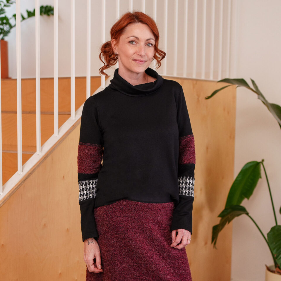 Plusieurs combinaisons sont possibles avec le chandail chicouté. La version noir & merlot est à son meilleur lorsqu’elle est portée avec notre jupe 7/8 pruche noir ou à nos pantalons cyprès gris denim, resinosa noir, carex ou lichen. Finalement, vous retrouverez exactement le même tissu sur les manches de la version noir & merlot que sur nos jupes rhododendron et mélèze. Le match parfait quoi!