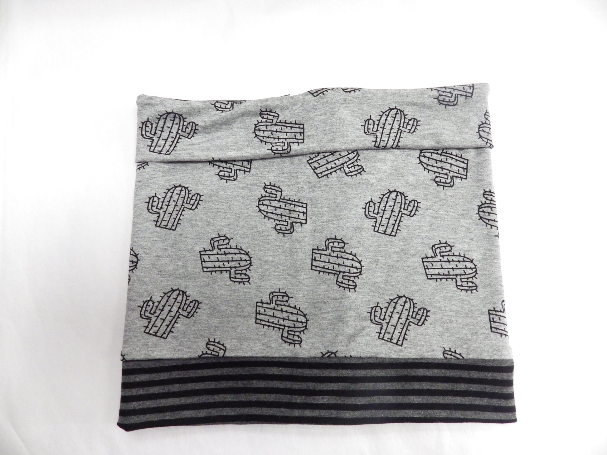 Cache-cou réversible, motif cactus et ligné gris et noir, 100% coton et 95% bambou, 5% spandex.