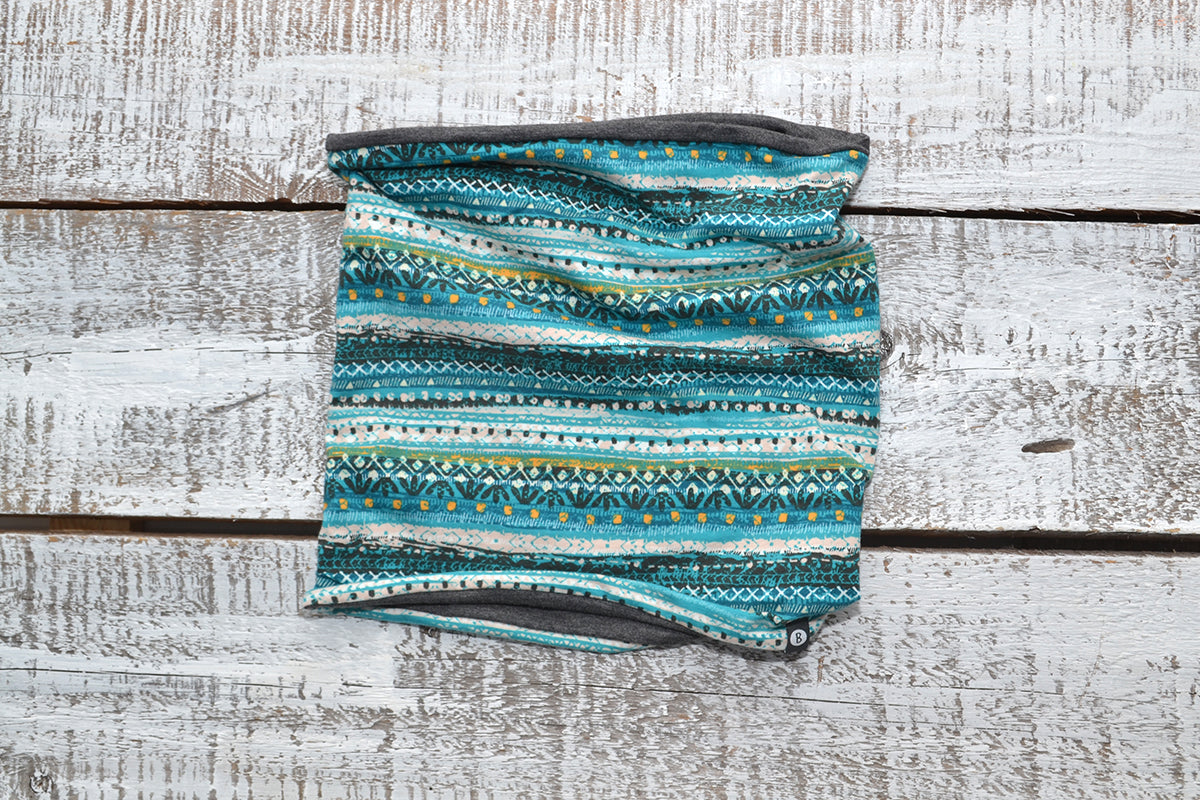 Cache-cou réversible, côté motifs et gris uni, 100 % coton et 95% bambou, 5% spandex.