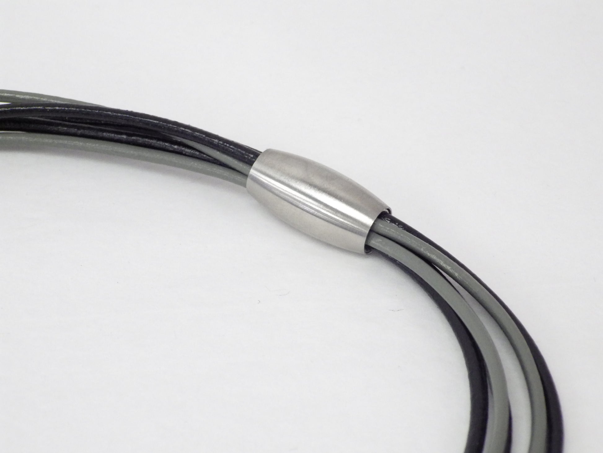 Ce collier choker à cordons de cuir se transforme en bracelet double lorsque plié en deux. L'attache est aimantée, facile à mettre et tient bien en place. Les pièces en acier inoxydable ne sont pas fixe et peuvent glisser aisément sur les cordons, vous permettant de les placer comme bon vous semble!