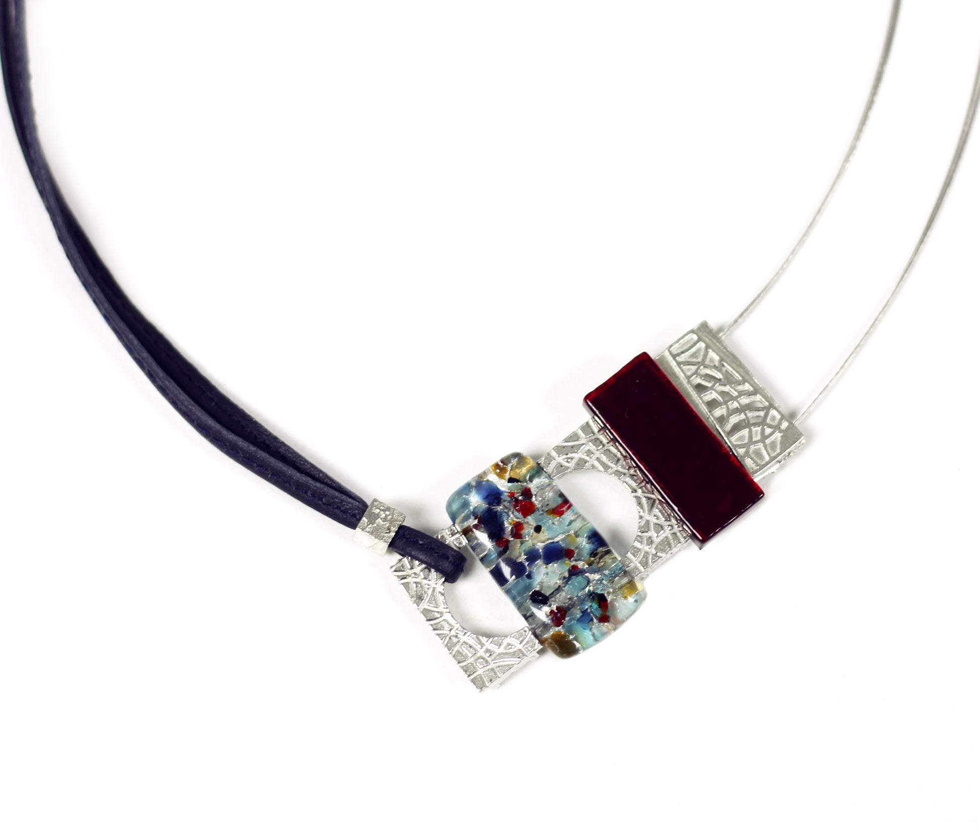 Collier verre et étain sur fils d’acier inoxydable (hypo-allergène) recouvert de nylon de couleurs.