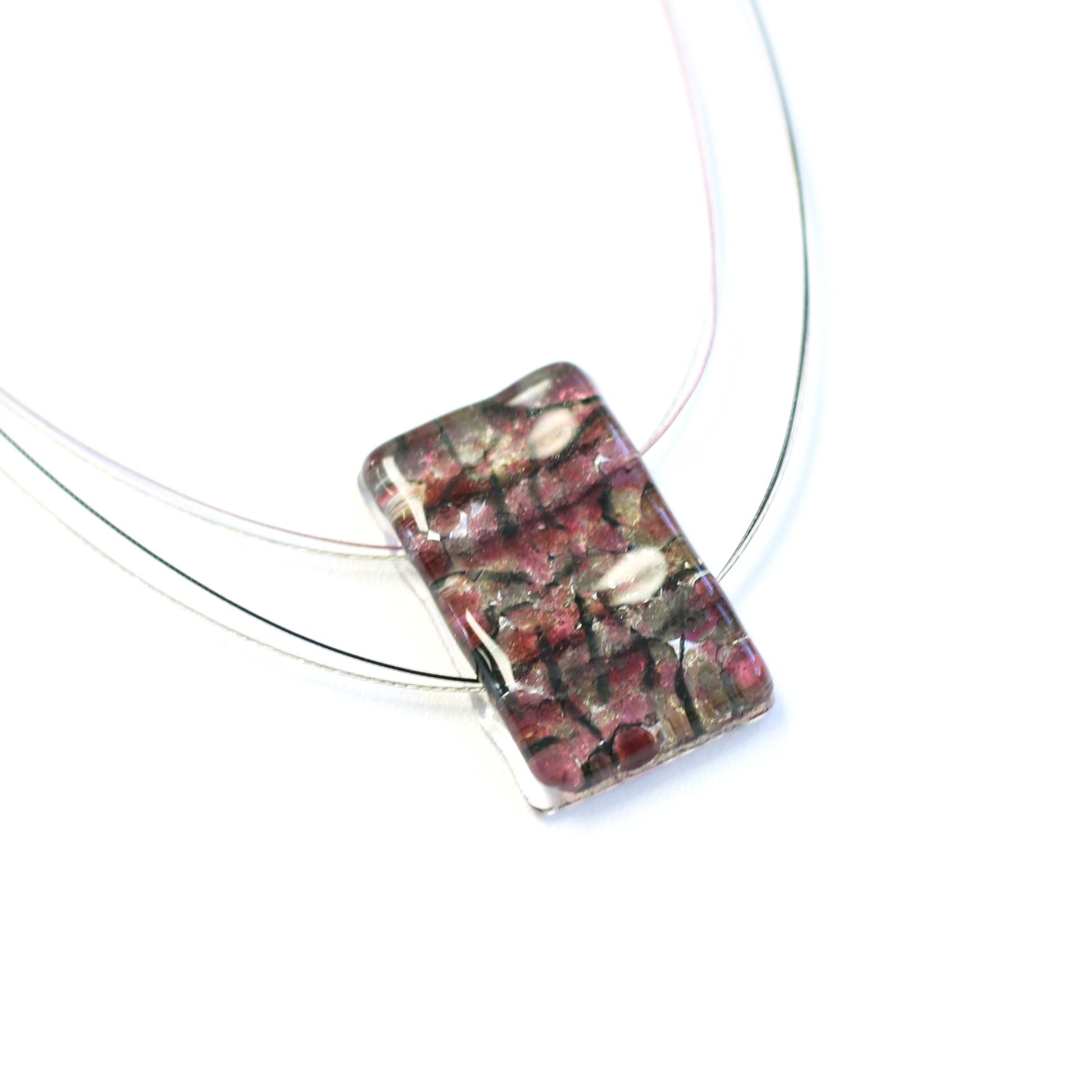 Collier de verre à 2 insertions sur fils d’acier inoxydable (hypo-allergène) recouvert de nylon de couleurs.