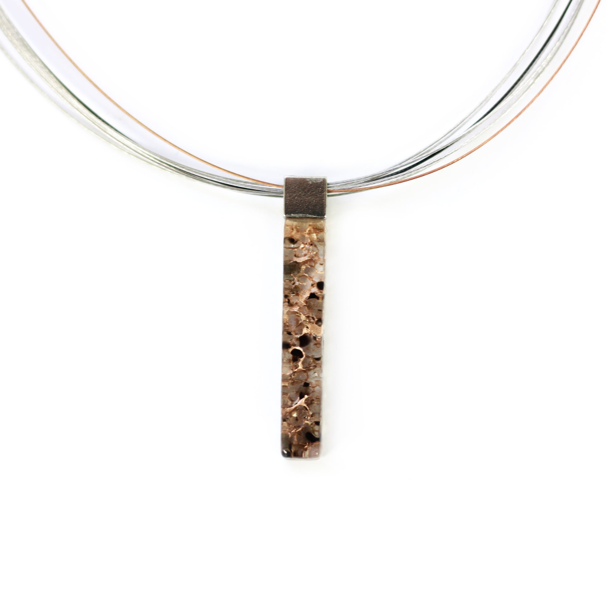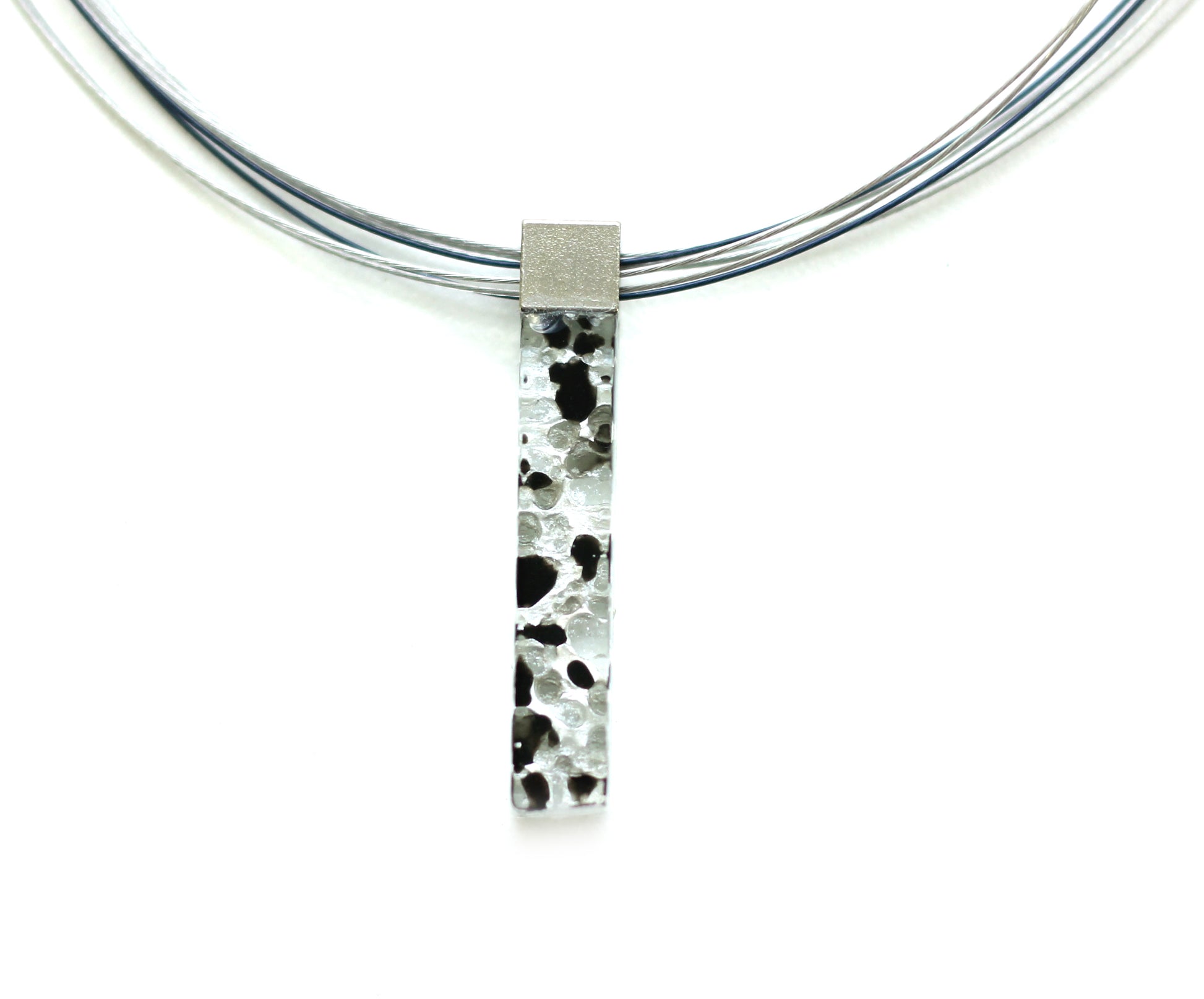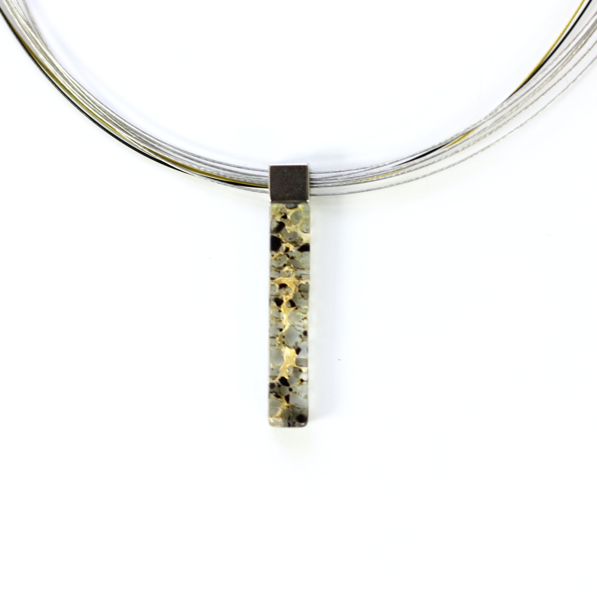 Collier de verre et d’acier inoxydable sur fils d’acier inoxydable (hypo-allergène) recouvert de nylon de couleur.