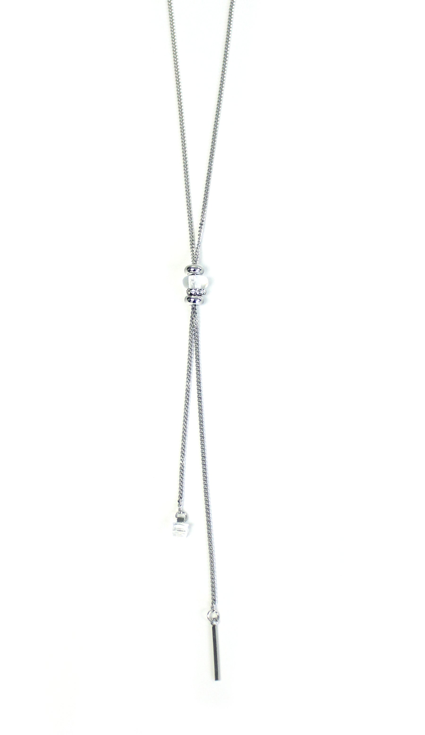 Sautoir ajustable sur chaîne simple en acier inoxydable assorti d’une perle en verre soufflée au chalumeau.