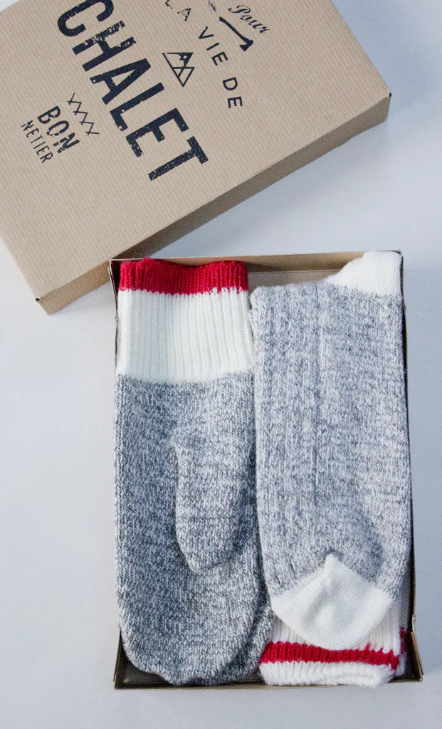 Ensemble de Chaussettes et Mitaines de laine dans un emballage "Prêt à Offrir". Ces bas et mitaines durables vous garderont au chaud et stylé(e)s cet hiver. Talons et pointes renforcées.