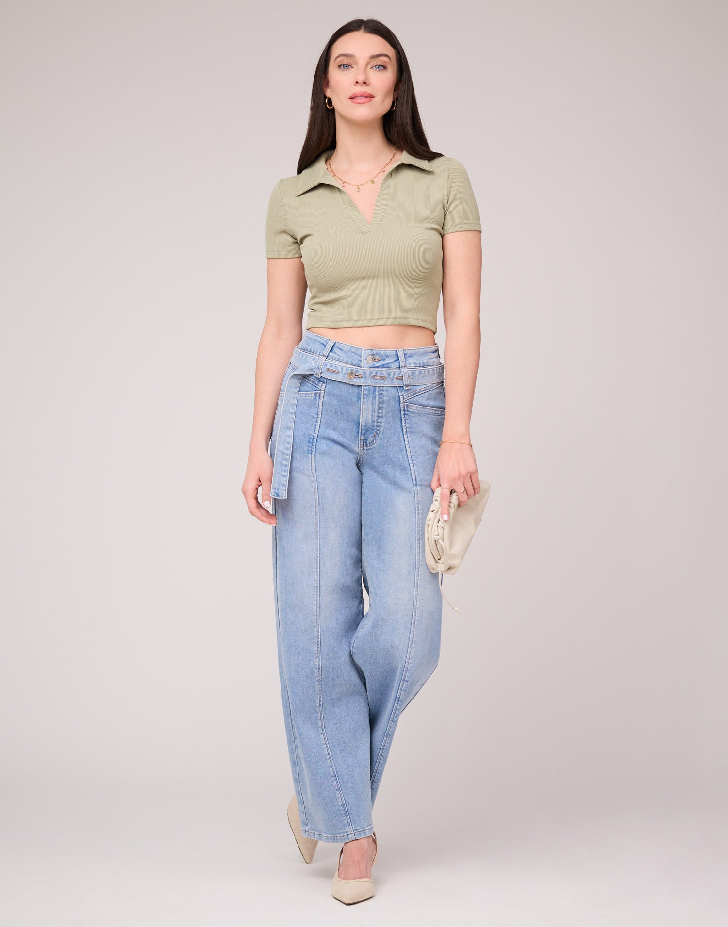 Ce jean bleu pâle combine une taille très haute et un entrejambe de 32". Il offre un aspect unique de denim superposé avec ses doubles passants de ceinture, sa ceinture détachable, ses poches obliques et ses coutures centrales avant et arrière. Ses subtils effets de délavage au niveau des cuisses ajoutent une touche tendance.