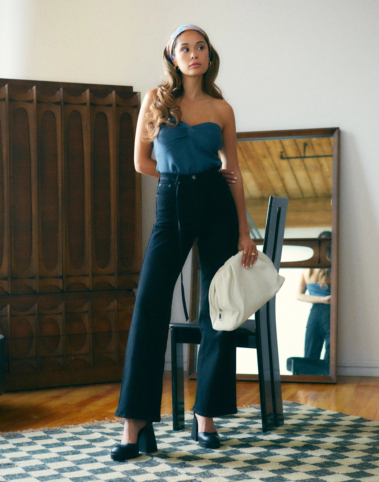 Lily, notre jean à coupe très évasée, a une silhouette qui est ample à partir des hanches vers le bas.