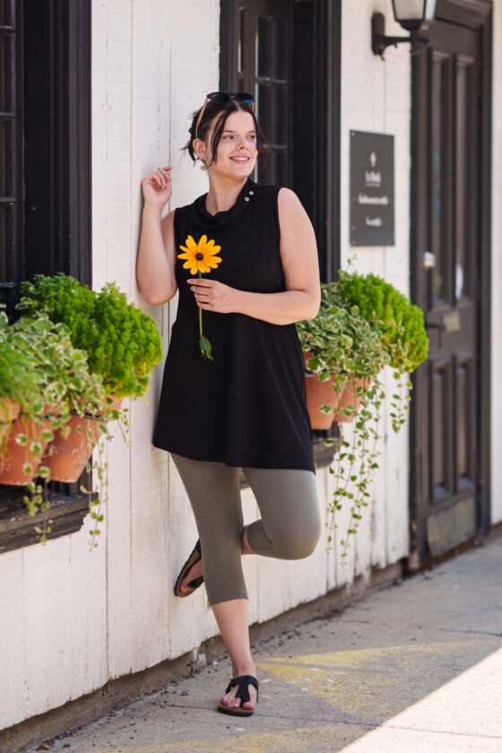 Pour lui assortir un bas, ce ne sont pas les choix qui manquent! Vous pouvez la porter pratiquement avec tous nos bas d’été. Voici quelques idées d’agencements : La version noire permet plusieurs agencements, comme avec notre palazo Hardy Sable (très élégant!), notre legging 3/4 kaki ou notre legging Lulu noir, notre legging corsaire noir et notre jupe jupon pour un look tout noir. Ce ne sont que quelques idées mais gageons que vous trouverez mille et une autres possibilités tellement elle est facile à assortir!