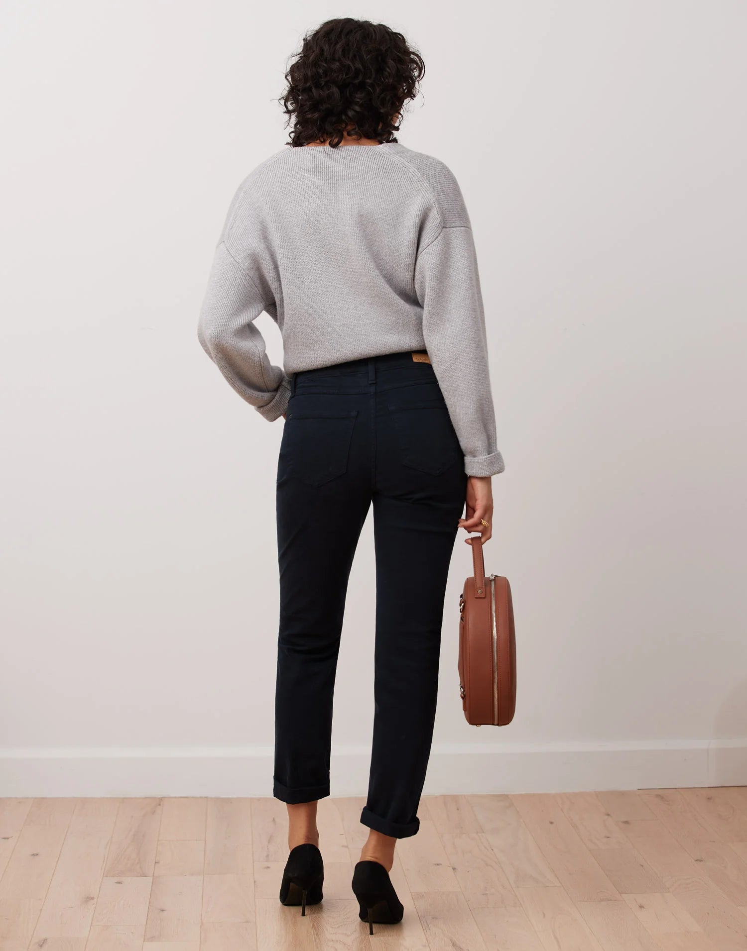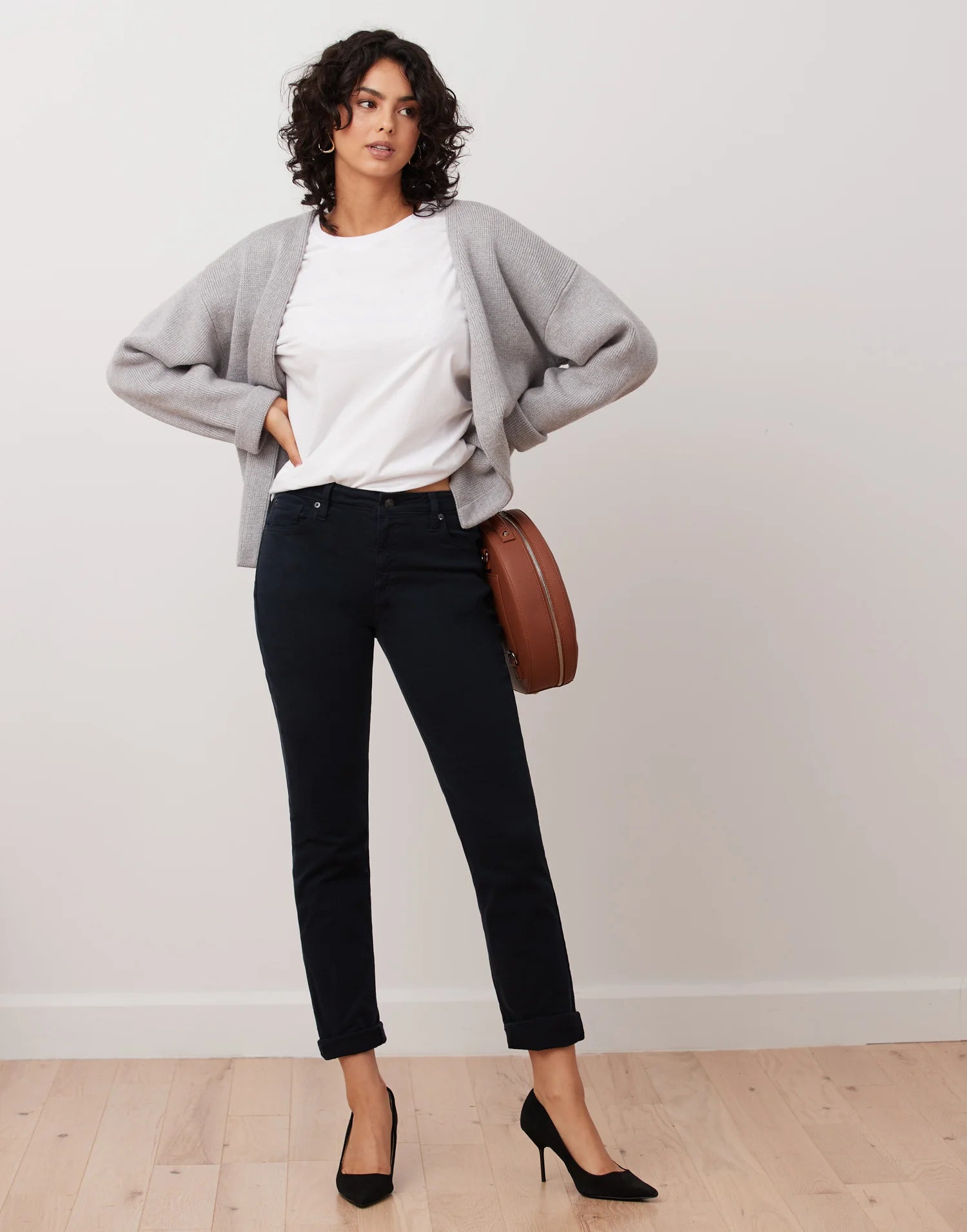 Malia, notre jeans coupe « girlfriend », a une silhouette décontractée et une jambe fuselée. Offert dans la couleur Blue Graphite, ce jean à taille classique est d'une couleur bleu-noir foncé offrant un look sophistiqué et décontracté, un entrejambe de 27" et un ourlet à revers. (29" sans revers)