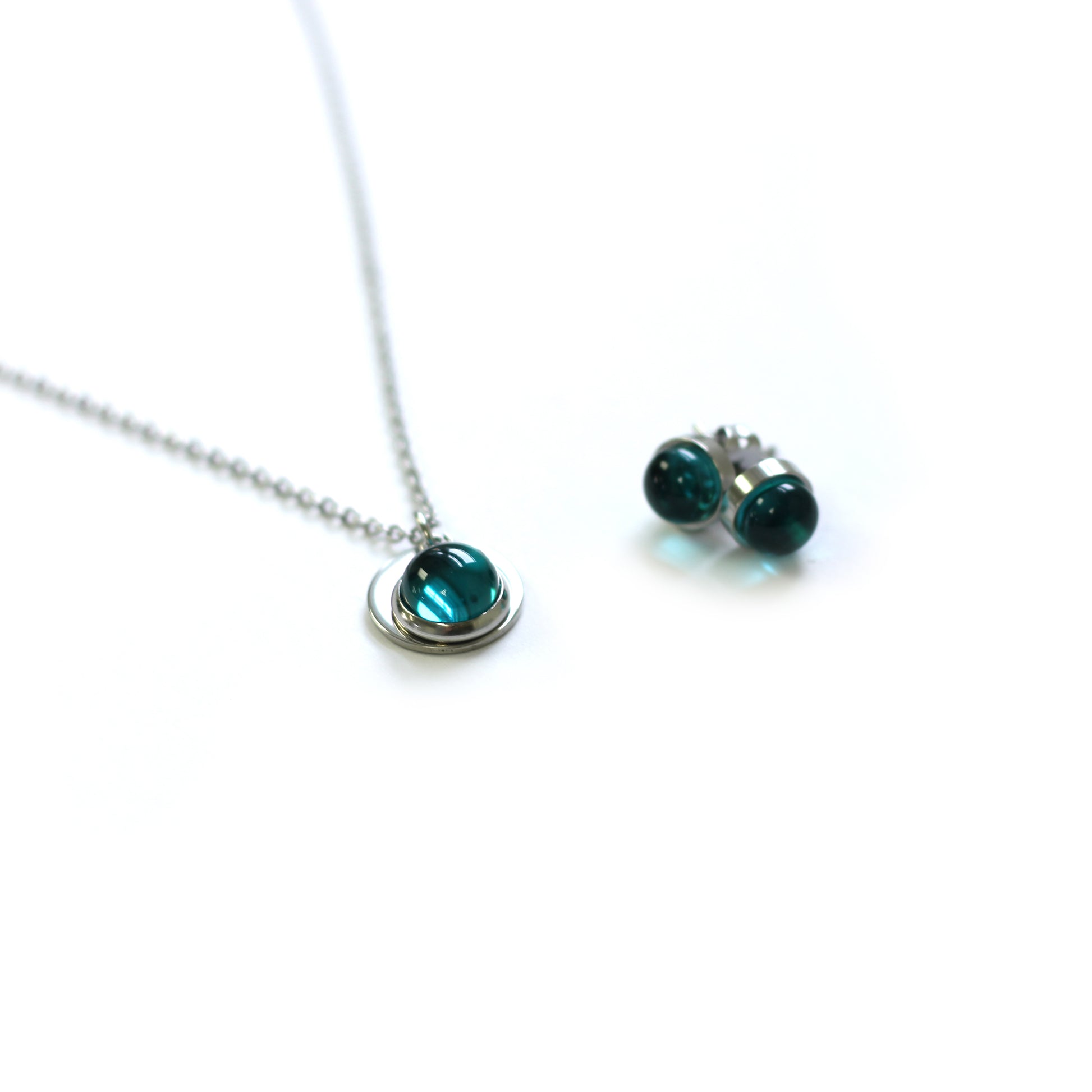 Petit pendentif cercle en acier inoxydable et verre (1.3 cm) sur une chaîne en acier inoxydable de 18 pouces incluant une chaînette d’extension de 5 pouces. Boucles d’oreilles fabriqué entièrement en verre sur une tige d’acier inoxydable. (hypoallergénique)