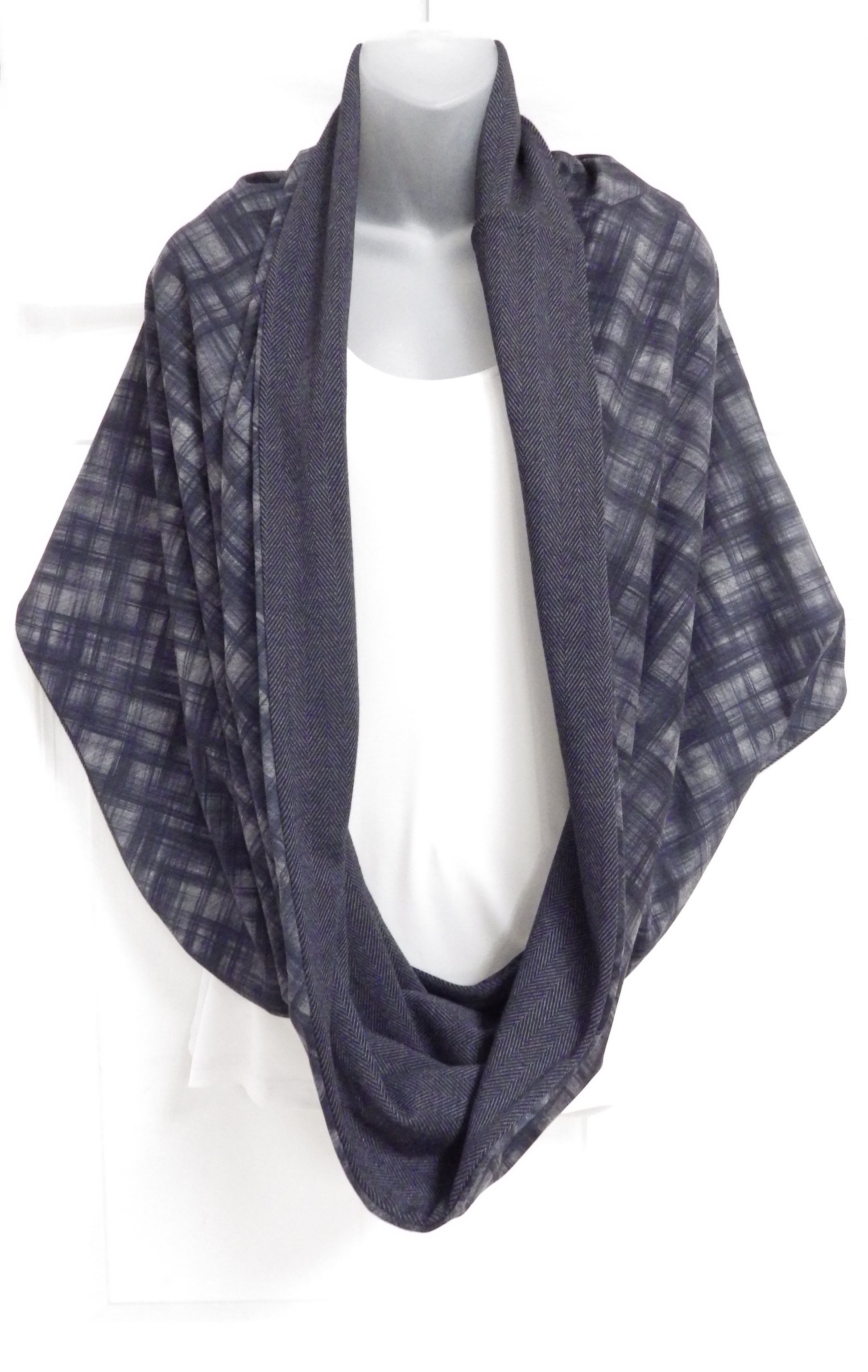 Large foulard infini bleu réversible, un côté avec carreaux tartan et l'autre avec chevrons.