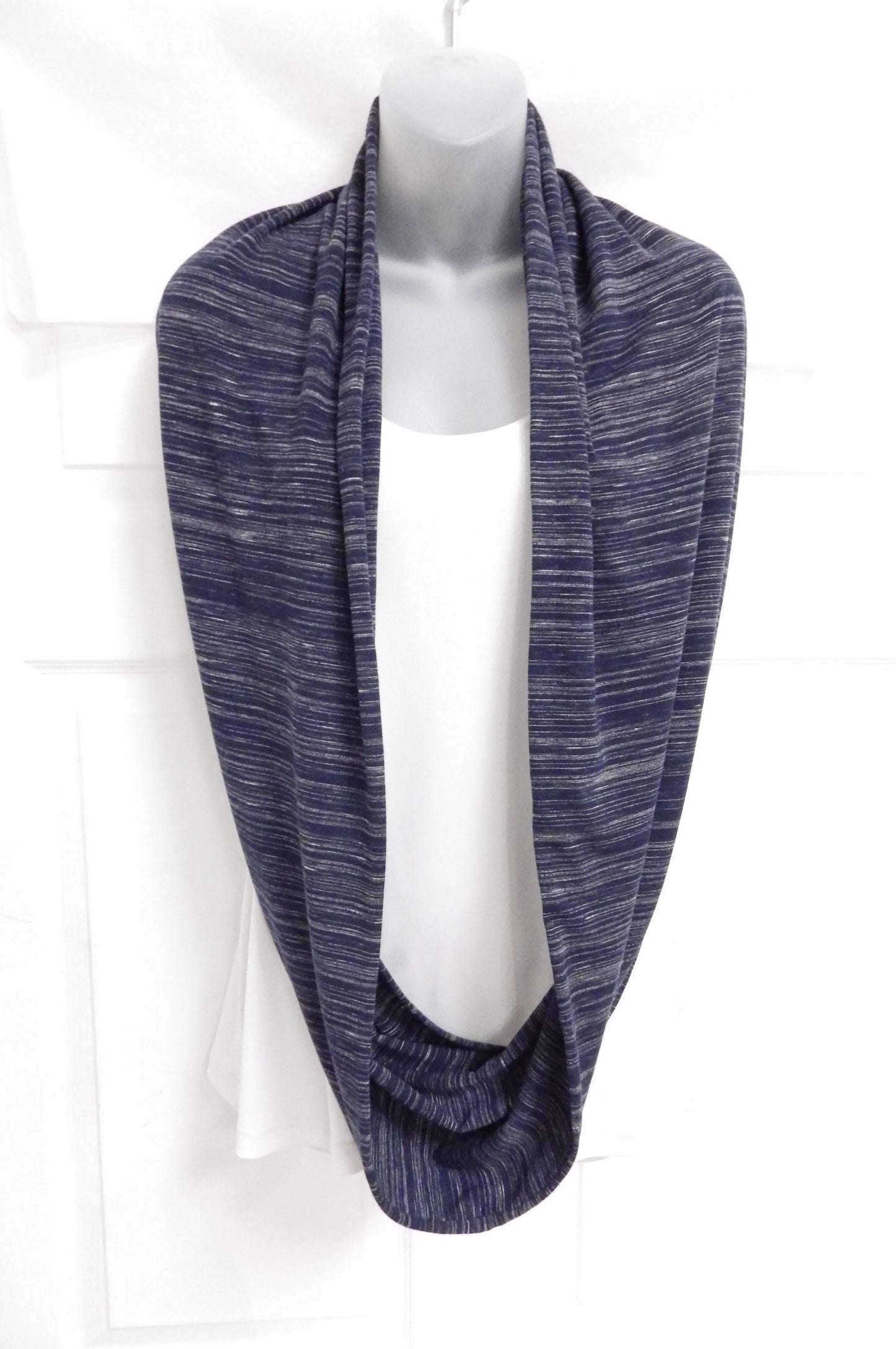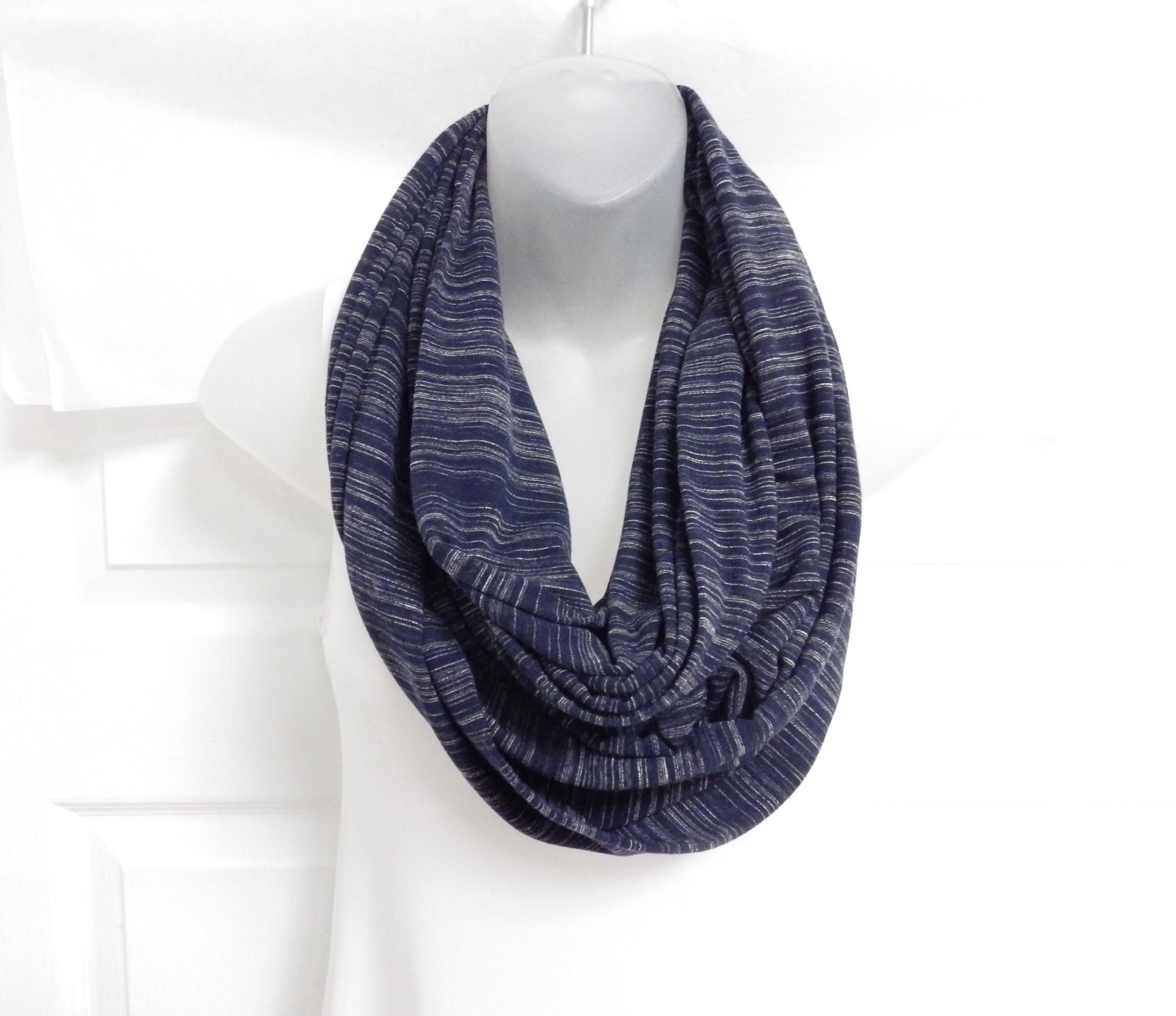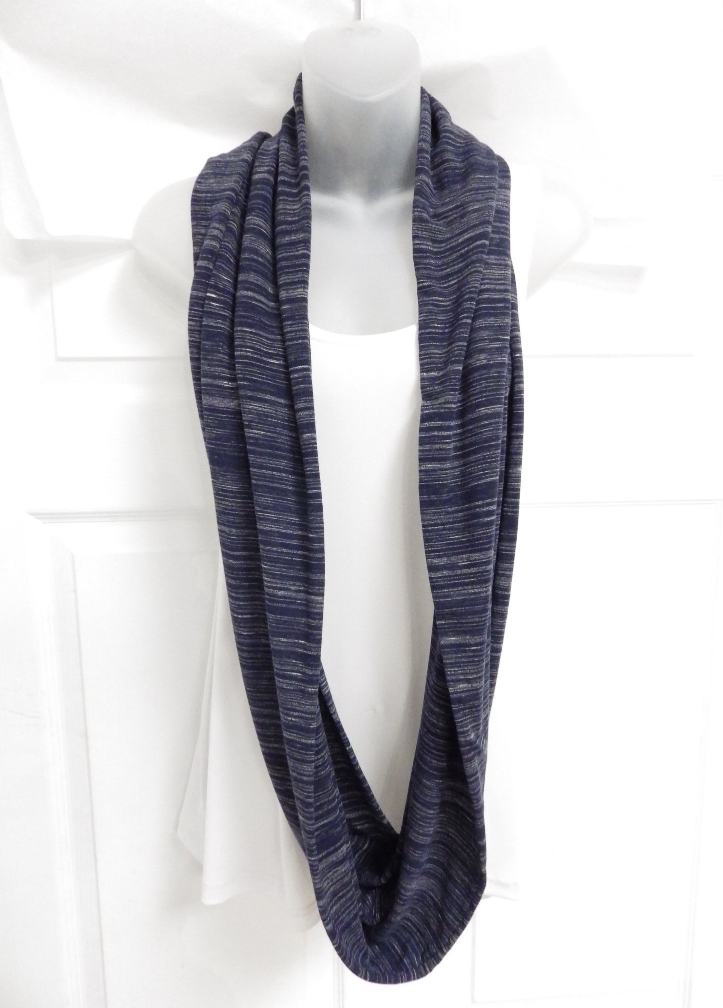 Foulard infini long avec rayures de différentes teintes de bleu qui se croisent.