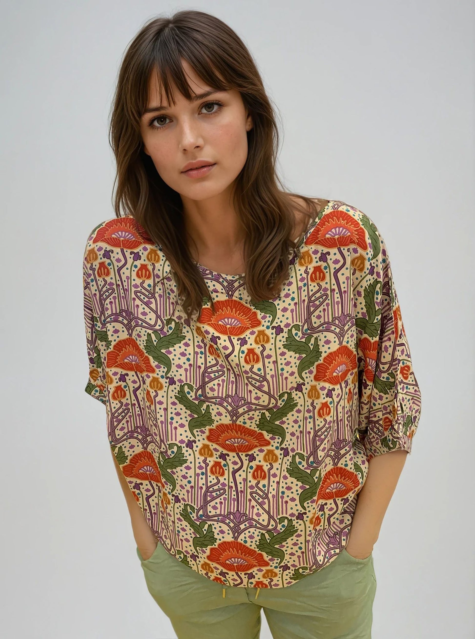 Son imprimé floral audacieux marie de grandes fleurs rouges à un feuillage vert, le tout rehaussé de tiges violettes et de motifs ponctués, sur un fond crème chaleureux. Ce design artistique apporte une allure vintage et joyeuse, parfait autant pour une sortie décontractée que superposé sous un veston.