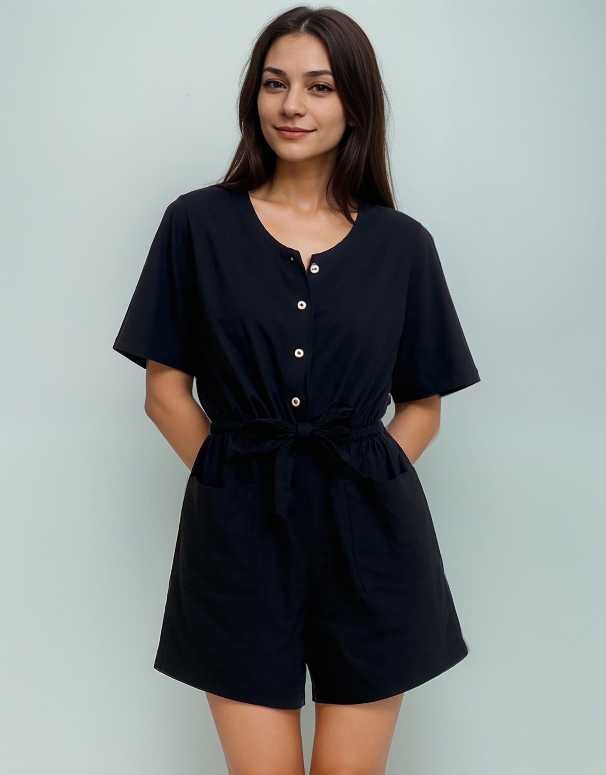 JS22 Combinaison courte à boutons – Noir uni - Viscose spandex