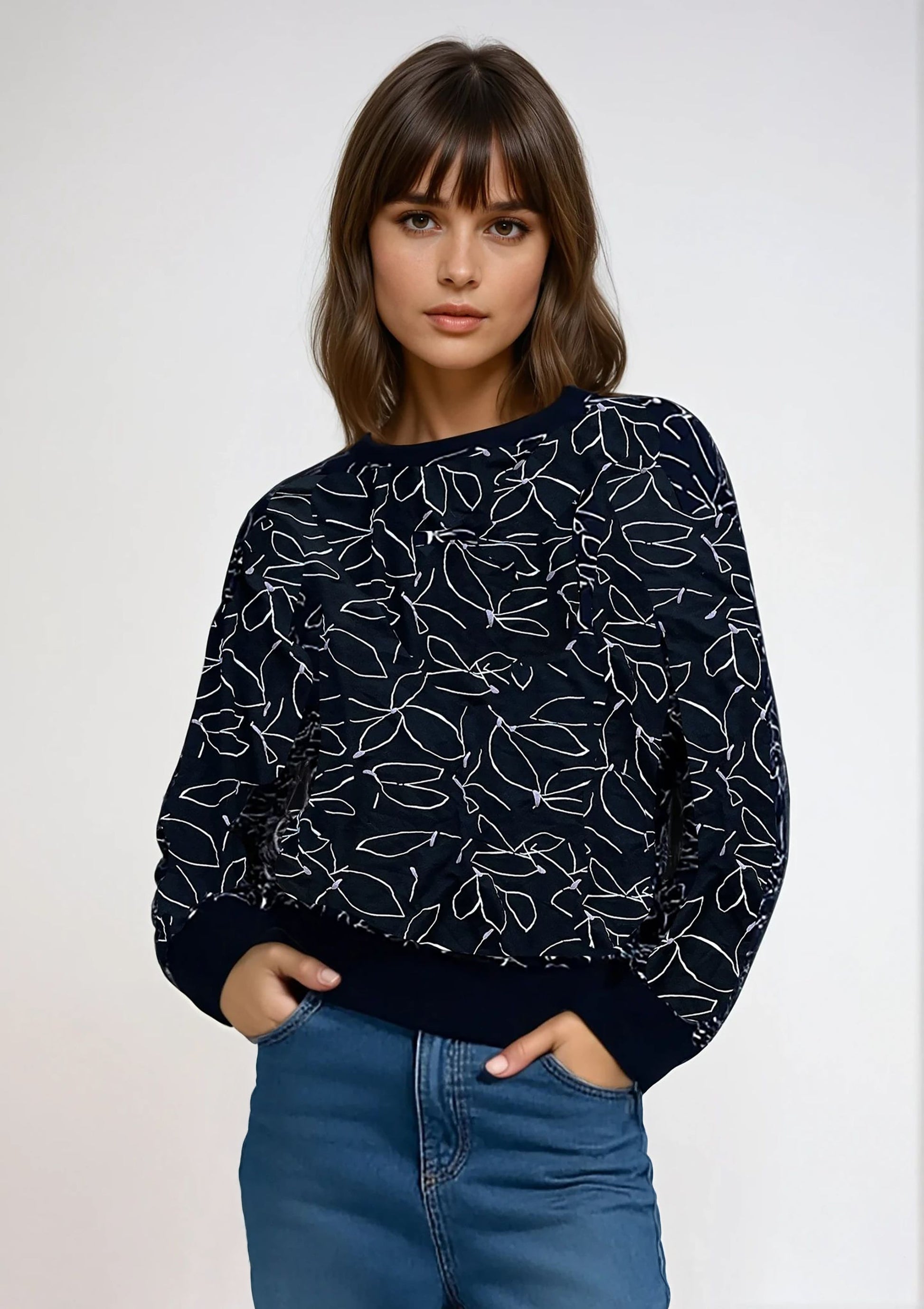 Chandail à manches longues – Imprimé feuillage noir, blanc et rose pâle