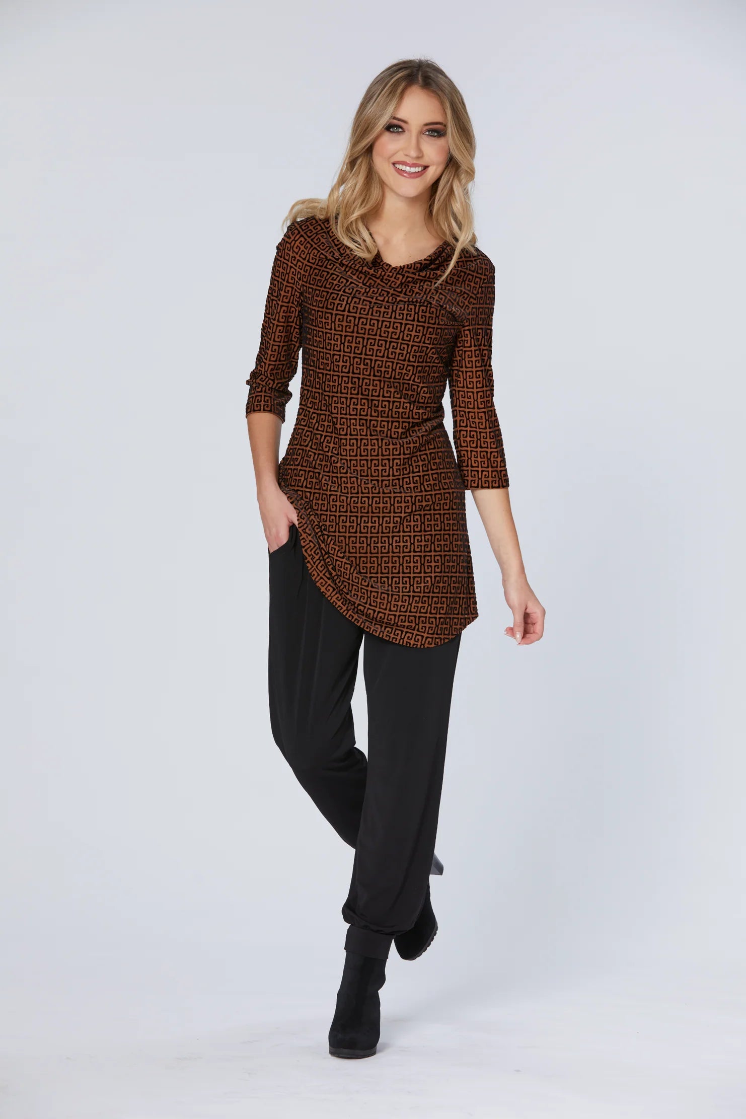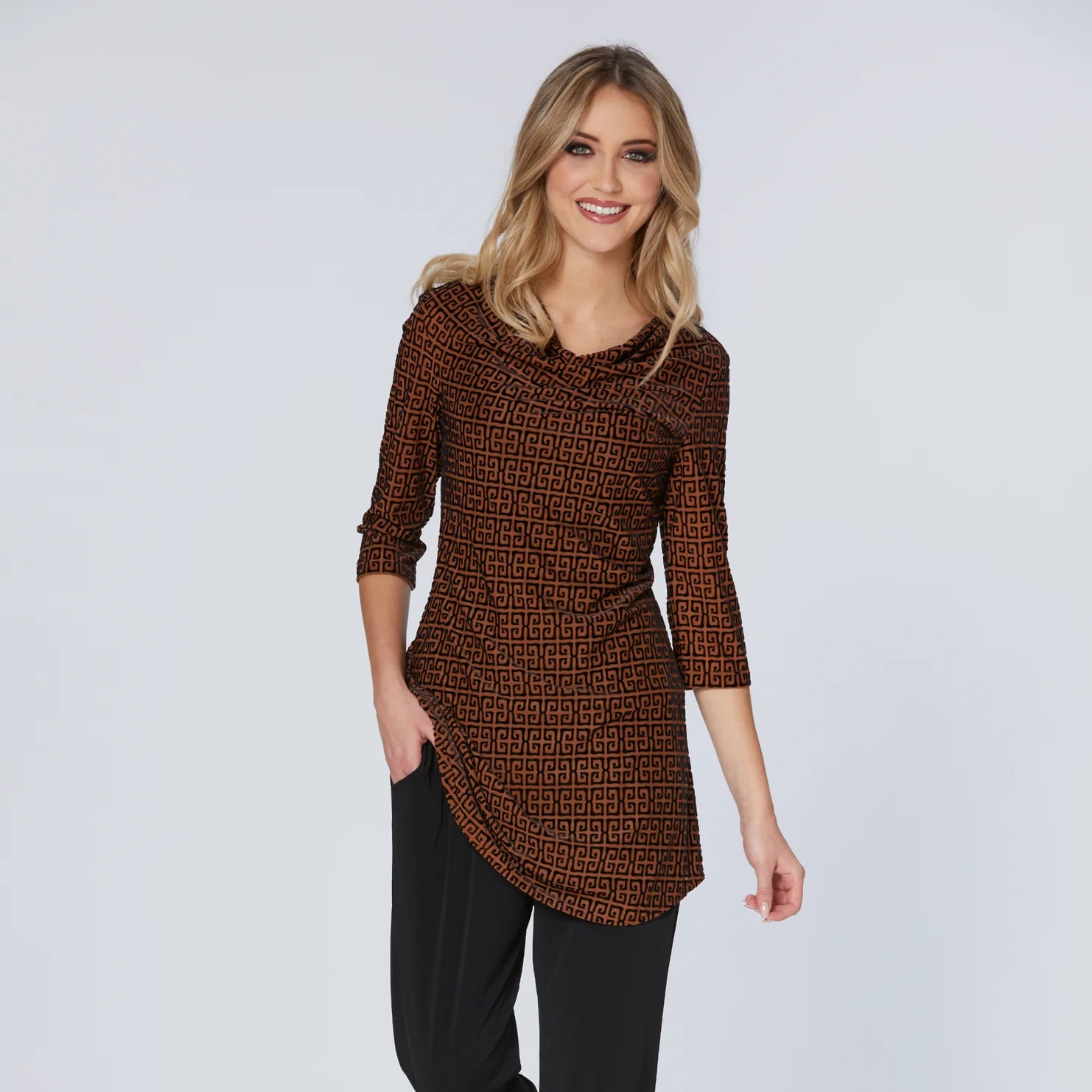Tunique à motif géométrique marron. Un choix parfait pour un look décontracté et élégant. Confortable et polyvalente, idéale pour toutes occasions.