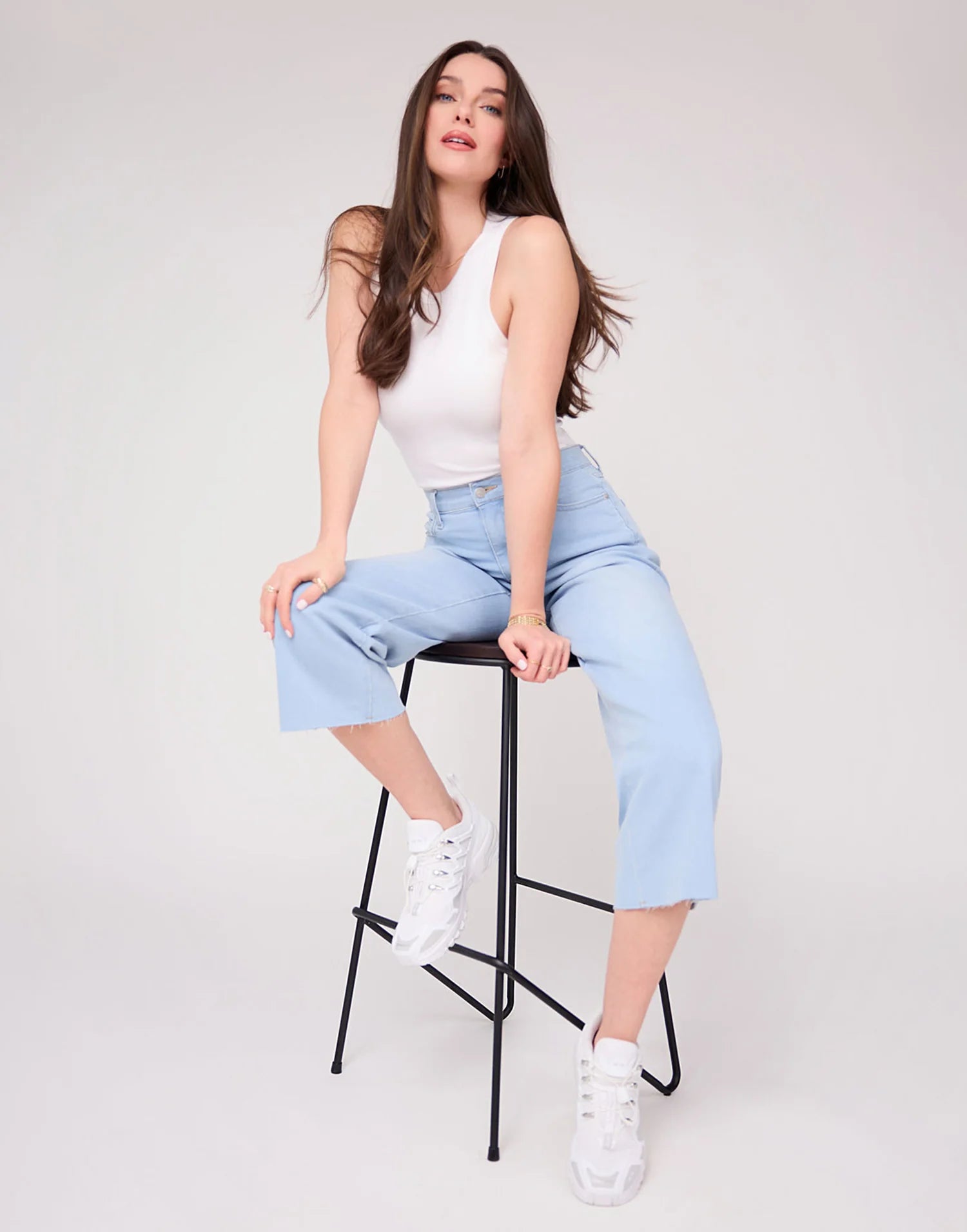 Présenté en Cali Blue, ce jean taille haute présente un délavage bleu très pâle avec des ourlets bruts. Il a un entrejambe écourté de 25".