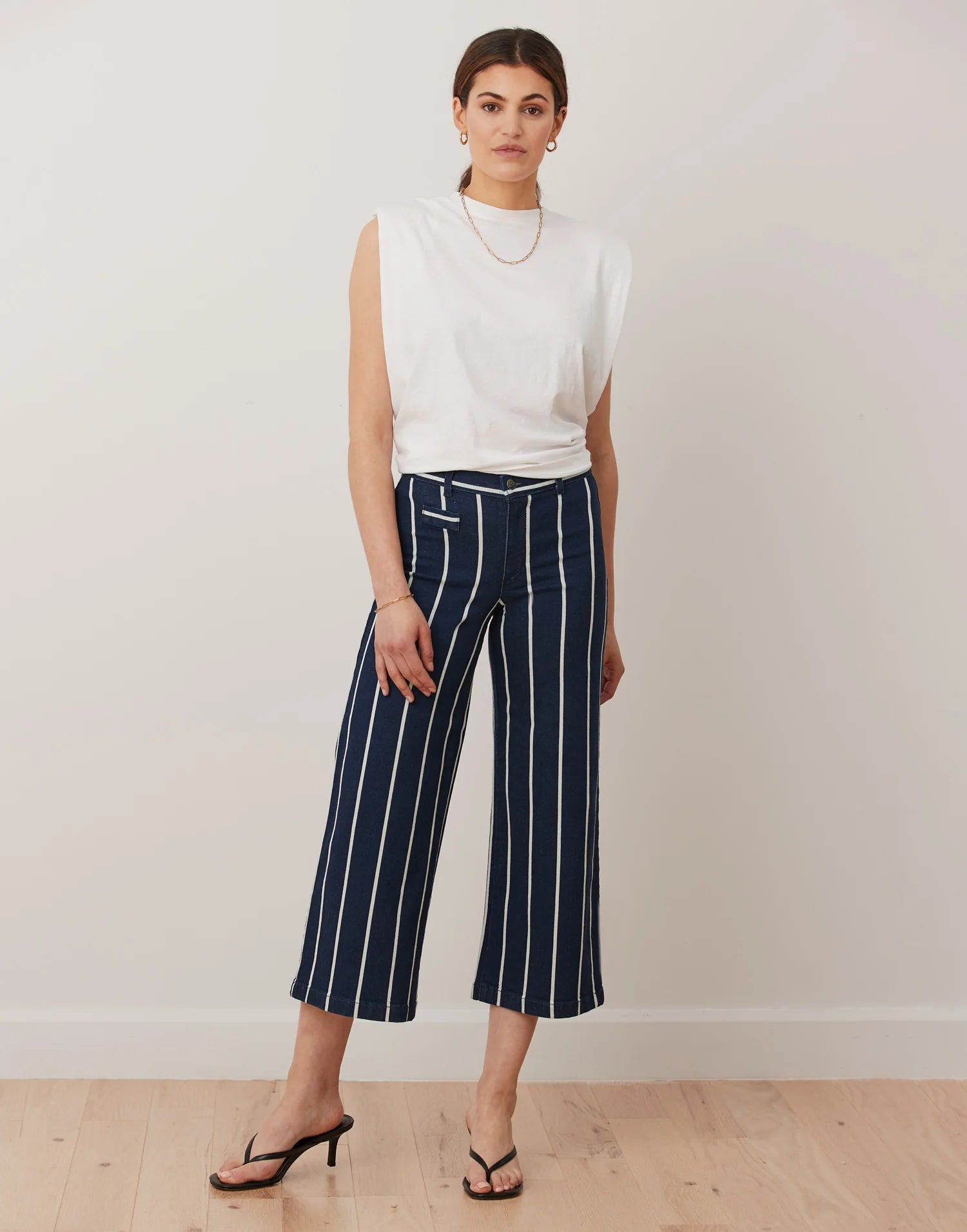 Ce modèle très évasé à taille classique a un entrejambe de 25", soit notre nouvelle longueur écourtée à la cheville. Il a de fausses poches de type chino et est fait d’un tissu recouvert de mini-rayures.
