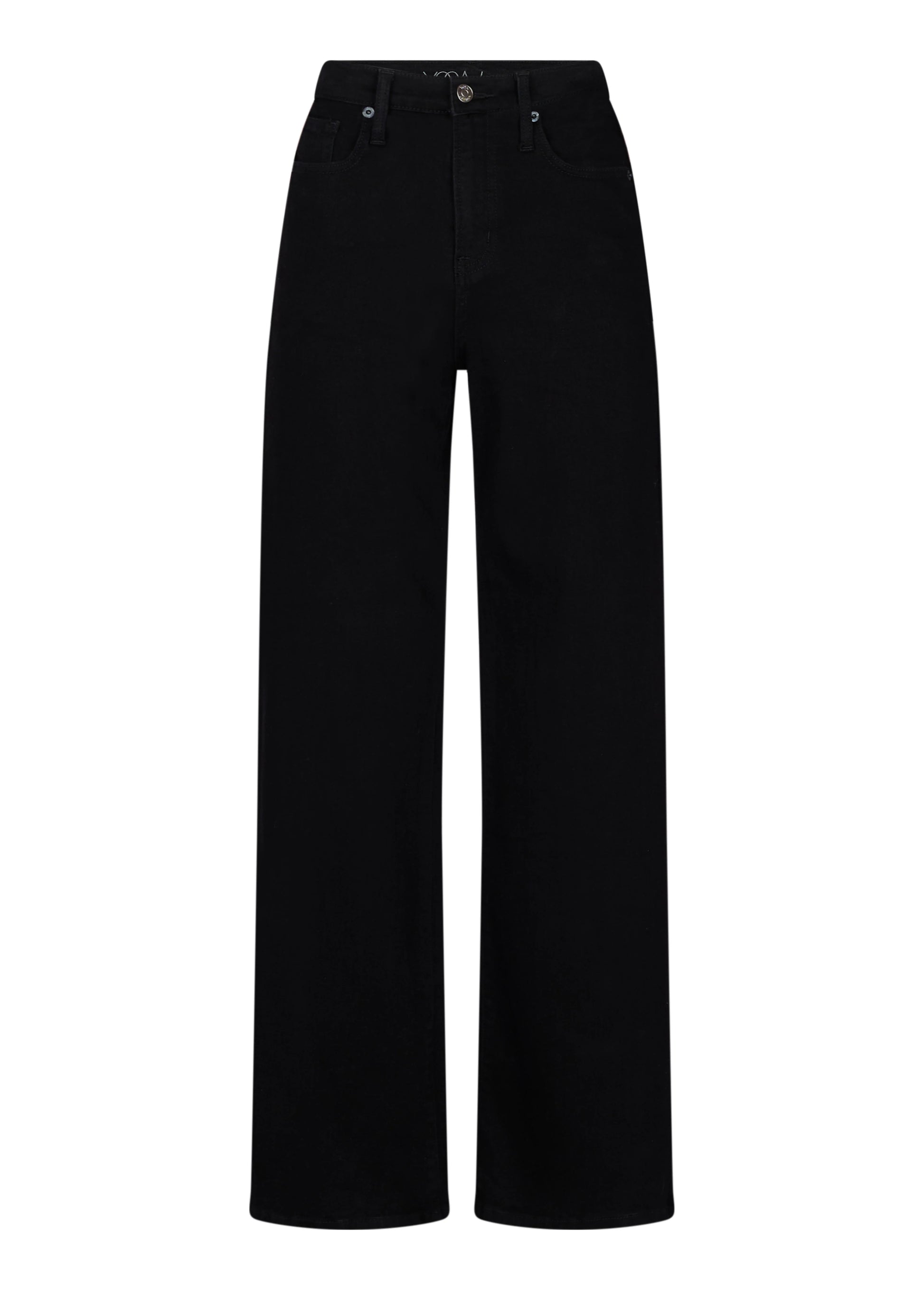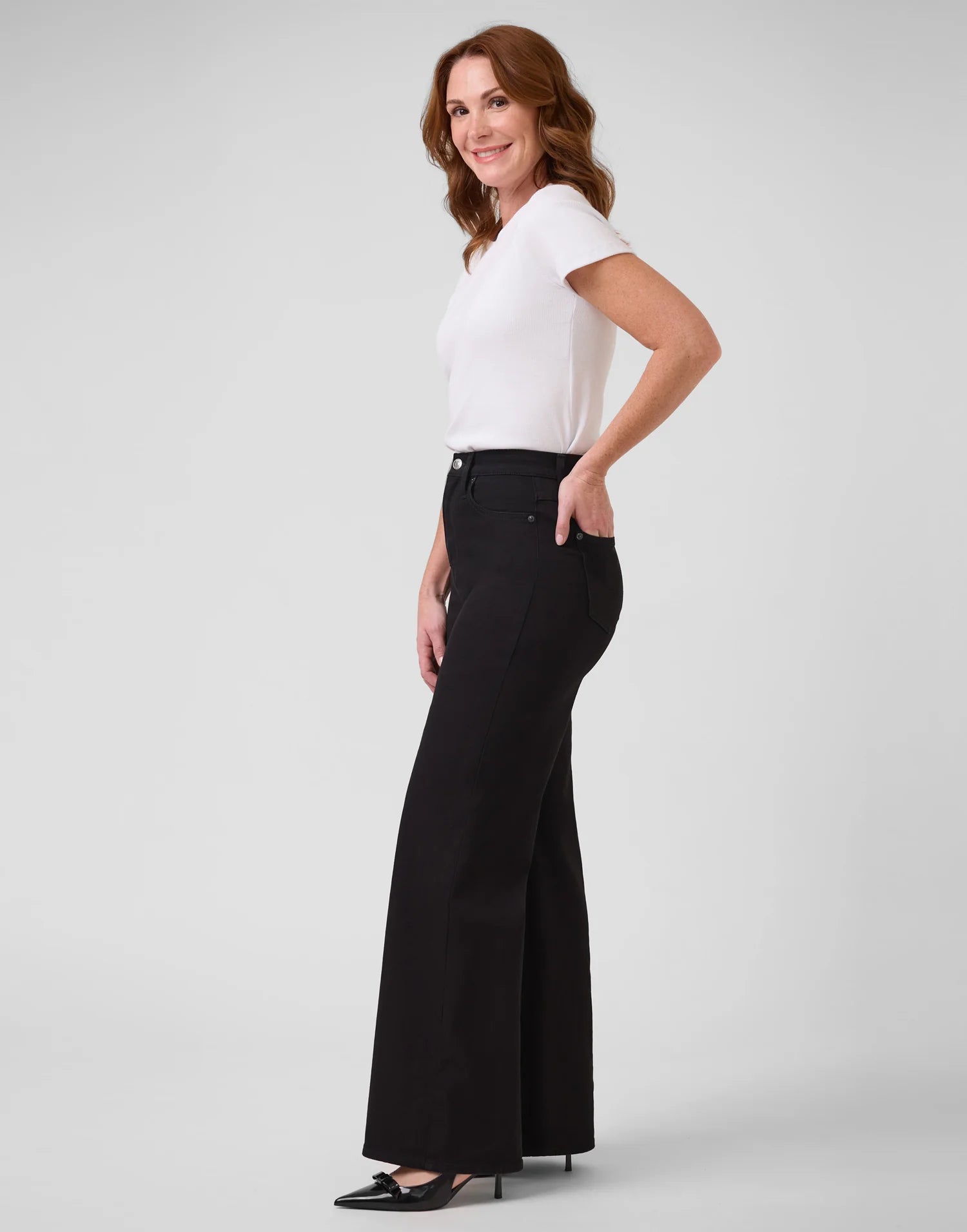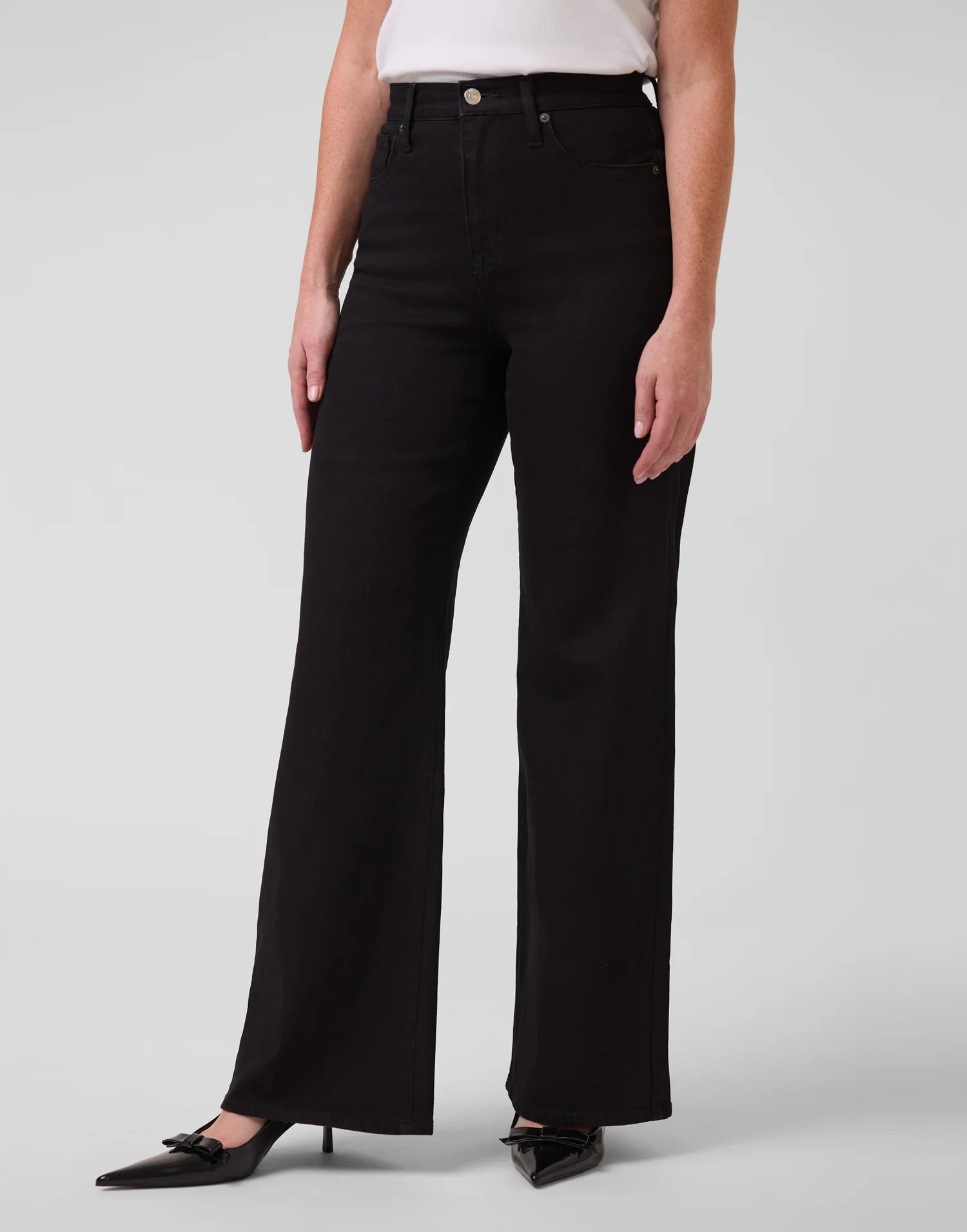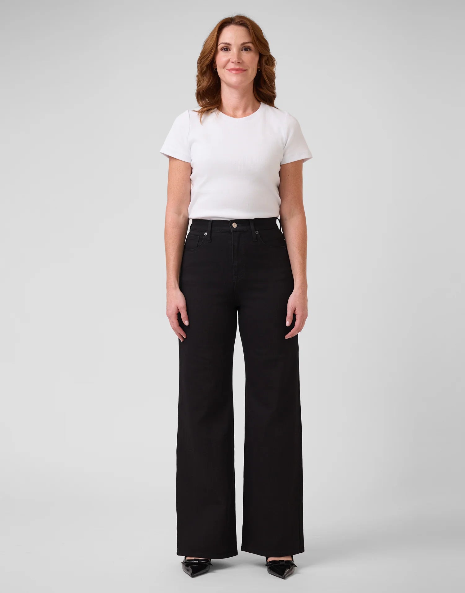 Notre denim léger à jambes larges préféré est de retour ! Il présente une taille haute confortable qui se situe juste au niveau du nombril, une longueur d'entrejambe de 32 pouces, et un lavage noir profond avec une fermeture à bouton gris brossé pour une touche de contraste élégante.
