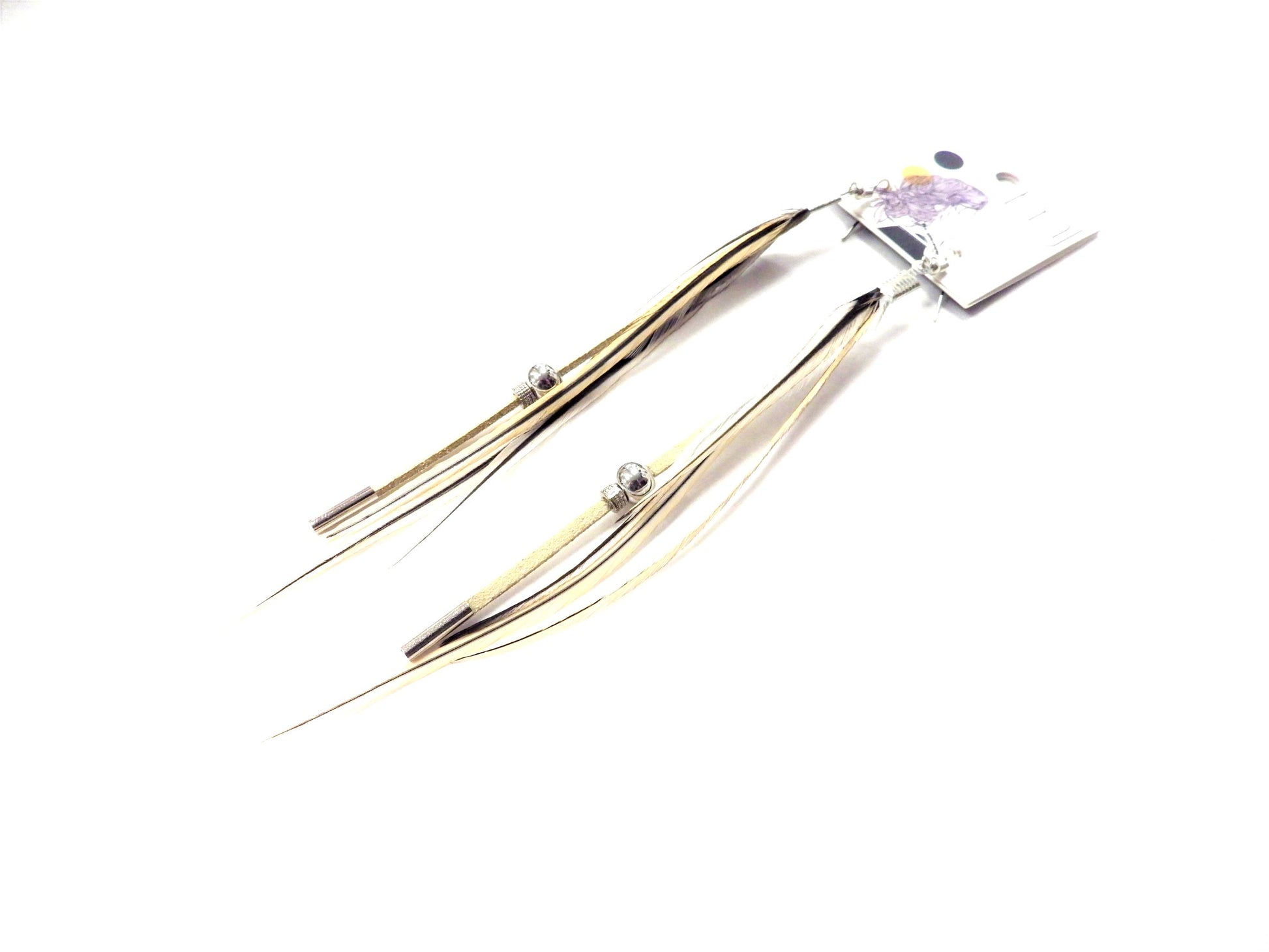 Boucles d'oreilles de plumes avec attaches en crochet d'acier inoxydable. Cordon de cuir beige agrémenté de pièces d'acier inoxydable, plumes deux tons noires et blanc cassé/beige. Longueur approximative de 17 cm (du crochet au bout de la plus longue plume).