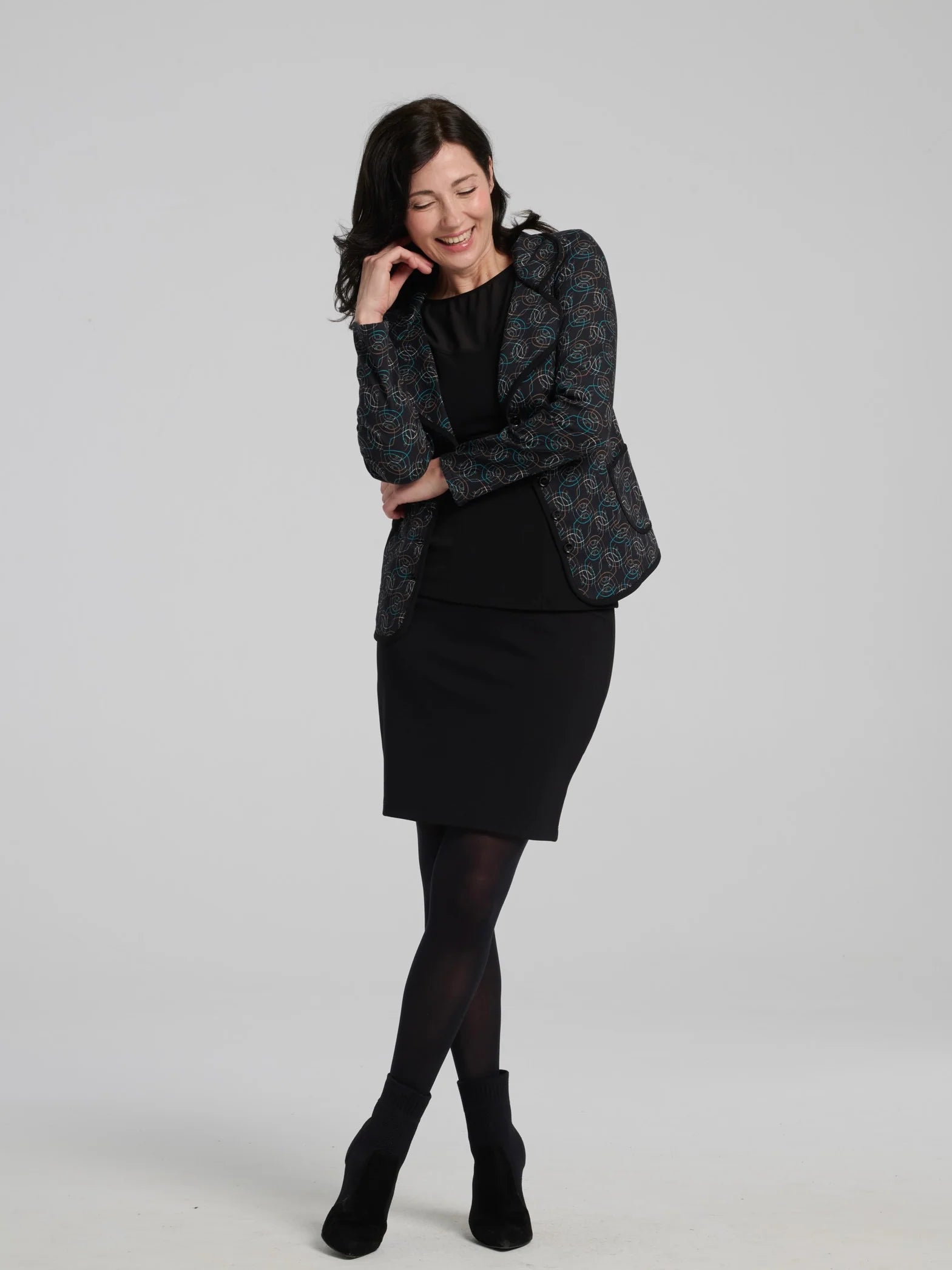 Il existe des pièces qui imposent leur présence sans jamais hausser la voix. Nara en est l’exemple parfait. Son tissu extensible, relevé de motifs géométriques turquoise et brun, joue avec les contrastes avec une assurance qui ne passe pas inaperçue. Ajustée et coupée près du corps, elle s’arrête juste au-dessus des hanches pour dessiner une silhouette nette et contemporaine. Deux poches délicatement intégrées aux empiècements de côté apportent une touche de praticité discrète, tandis que le col tailleur arrondi et le biais qui souligne chaque bord ajoutent un raffinement maîtrisé. Portée fermée, elle structure l’allure avec assurance ; ouverte, elle se détend et révèle un esprit plus décontracté.