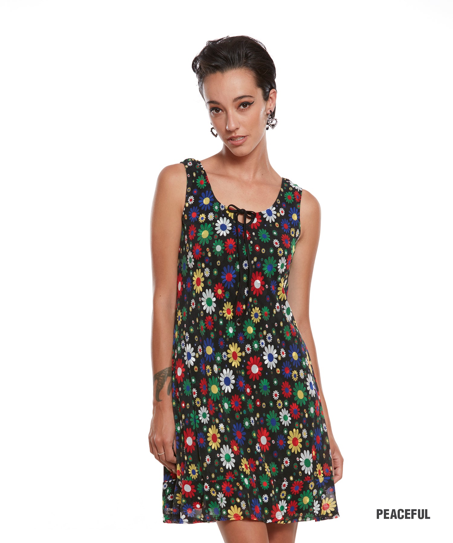 Jolie robe fleurie courte pour ce printemps! Encolure dégagée agrémentée d'un cordon en boucle, superposition d'un tissu mesh et uni avec effet vagué en bas, bretelle large et longueur mi-cuisse, selon votre taille.