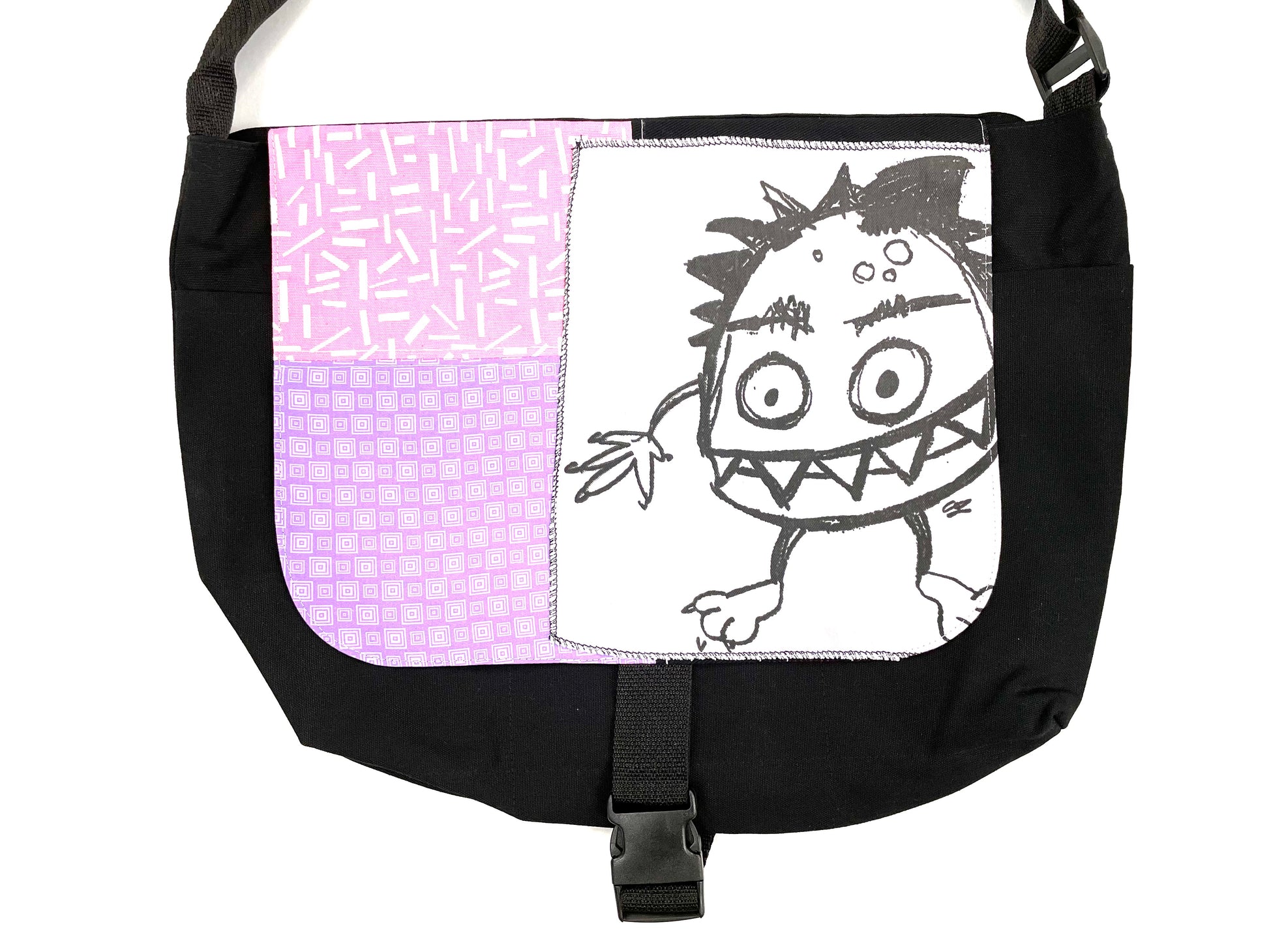 Matériel : -Extérieur : Canevas ou denim noir 100% coton. -Doublure intérieure : 100% coton style courtepointe (plus mince). Sangle de nylon ajustable de 55 po de long. Une fermeture éclair en nylon pour fermer le haut du sac. Une autre partie de fermeture éclair pour venir rattacher le rabat.