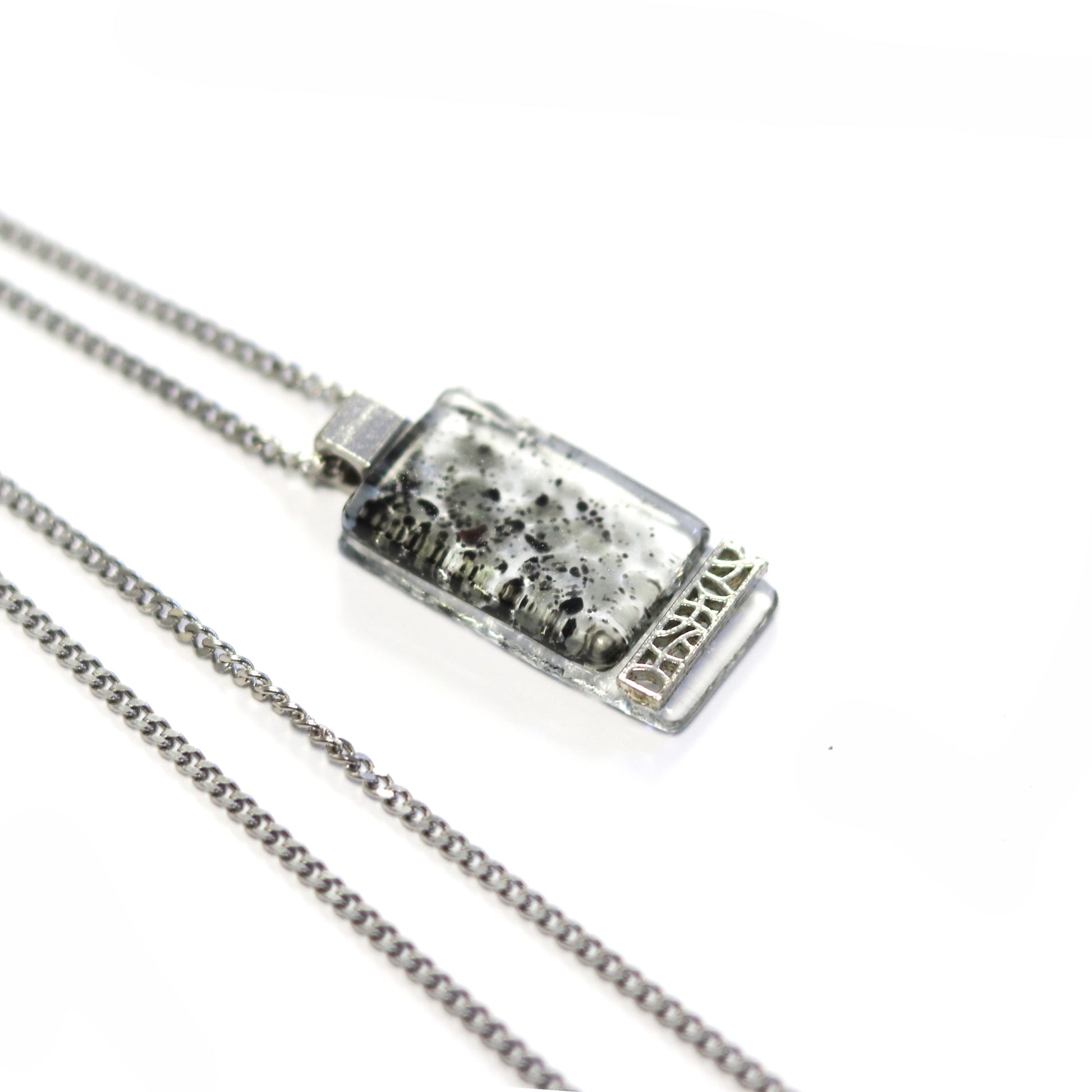 Le sautoir est sur une chaine en acier inoxydable de 24 pouces. Le pendentif en verre mesure15mm x 30mm et il est composé de verre ainsi qu’une pièce d’étain dans le bas.