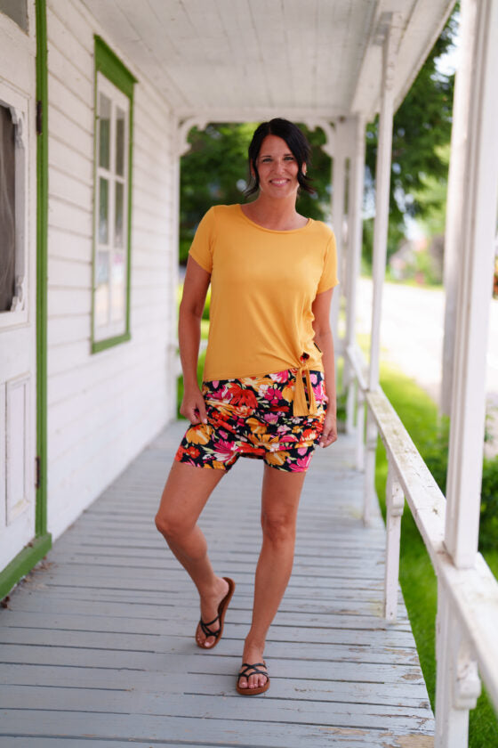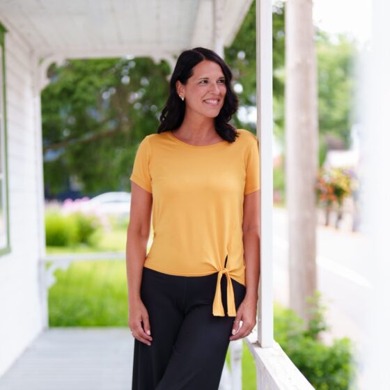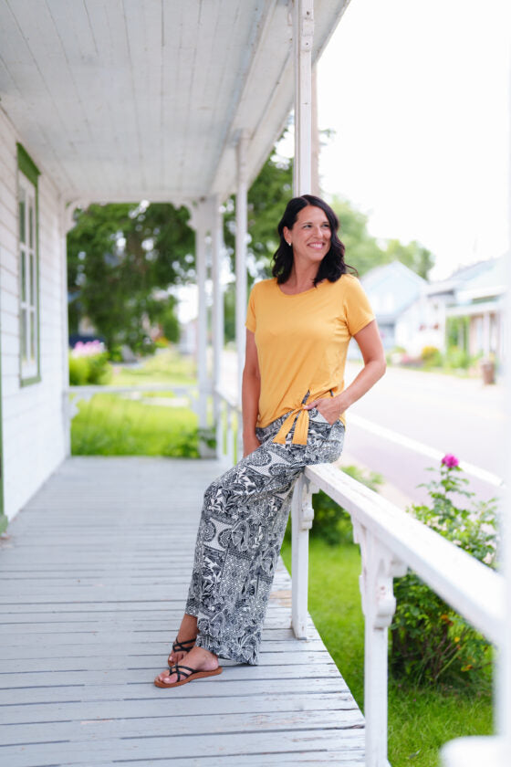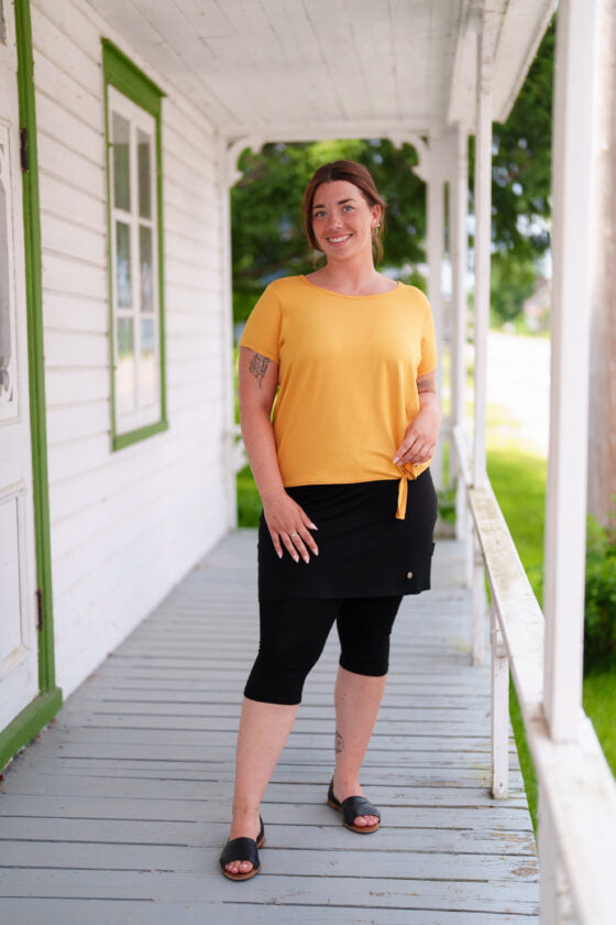 Le t-shirt tropical, en trois mots, c’est : couleur, douceur, candeur. Avec son nœud sur le côté et son tissu doux et extensible, il mise sur la simplicité pour mieux mettre en valeur votre éclat naturel. Un haut uni, mais loin d’être ordinaire! Si vous avez déjà acheté le t-shirt moderne à l’été 2025, sachez que c’est exactement le même patron. On a tout simplement changé le nom et le tissu pour un tissu tout aussi doux.