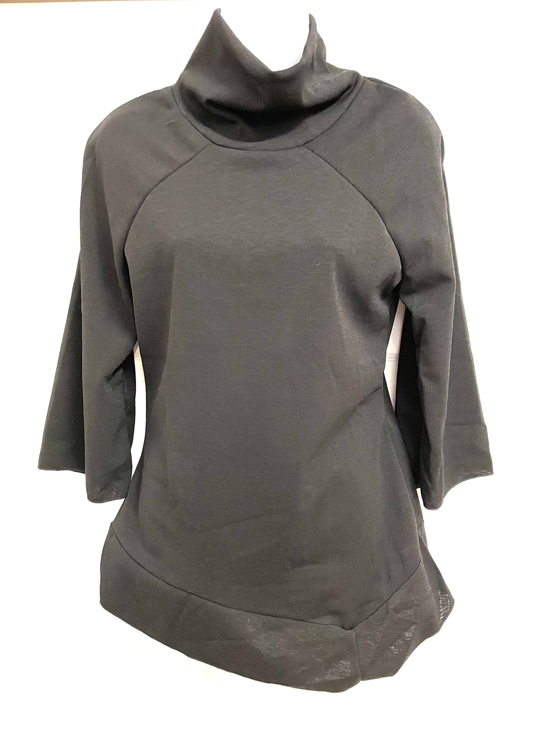 Tunique avec col roulé, look ample et décontracté au niveau du haut, puis ajusté aux hanches. Les poches et le choix du tricot ajoutent de la texture.