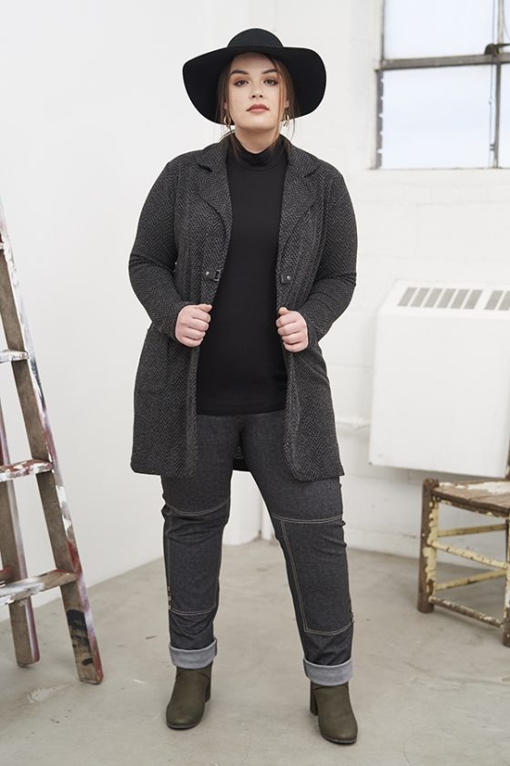 Ce tissu est fabriqué à Montréal! La mannequin porte la grandeur small / petit. Les vestons que les mannequins portent sur les photos sont le veston constellation à carreaux et les veston Orion.