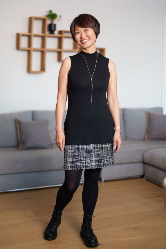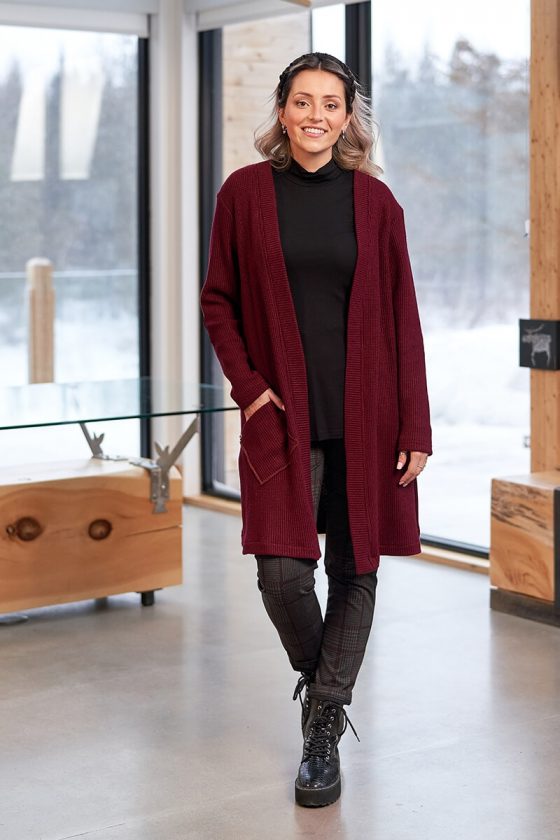 Le p’tit haut parfait à porter en toutes saisons. Son col montant est facile à enfiler et pas étouffant du tout. On aime beaucoup sa longueur qui cache un peu les fesses!