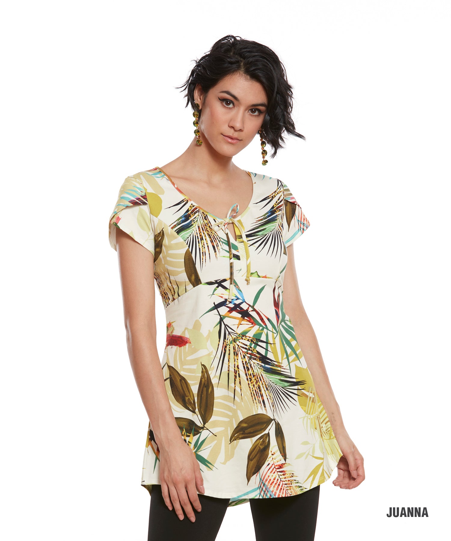 Jolie tunique courte inspirée de la jungle, sur un doux fond ivoire. Bas arrondi, coupe cintrée, encolure ronde avec cordon et petites manches.